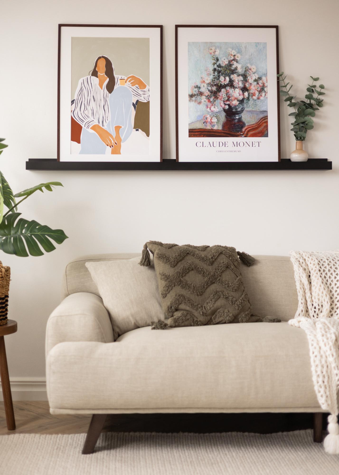 Visa och variera din väggkonst enkelt och snyggt med en elegant tavelhylla! Denna tavelhylla är tillverkad i MDF och är trendigt svartmålad med en fin, halvblank yta. Tavellisten har en stilren design med raka, enkla linjer och en minimalistisk känsla. Hyllplanet har en urfräst skåra i mitten som fungerar som stöd till dina tavlor och ger dem en snygg vinkel där de står lutande mot väggen.