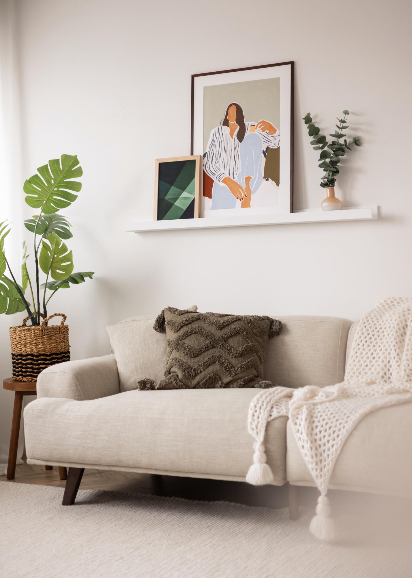 Med en praktisk tavelhylla kan du enkelt och snyggt visa upp och variera dina tavlor! Denna eleganta tavellist är tillverkad i MDF och är vitmålad med en vacker, halvblank yta. Designen är stilren med enkla, raka linjer och en tidlöst minimalistisk känsla. I mitten av hyllplanet löper en urfräst skåra som ger stöd åt dina tavlor och ger dem en perfekt vinkel där de står lutande mot väggen. Tavelhyllan har också förborrade hål och i förpackningen medföljer lämpliga skruvar och pluggar för att göra det hela ännu lite enklare!