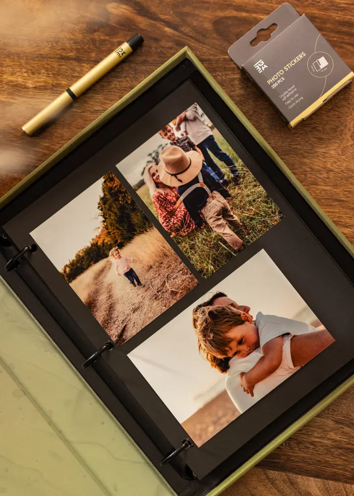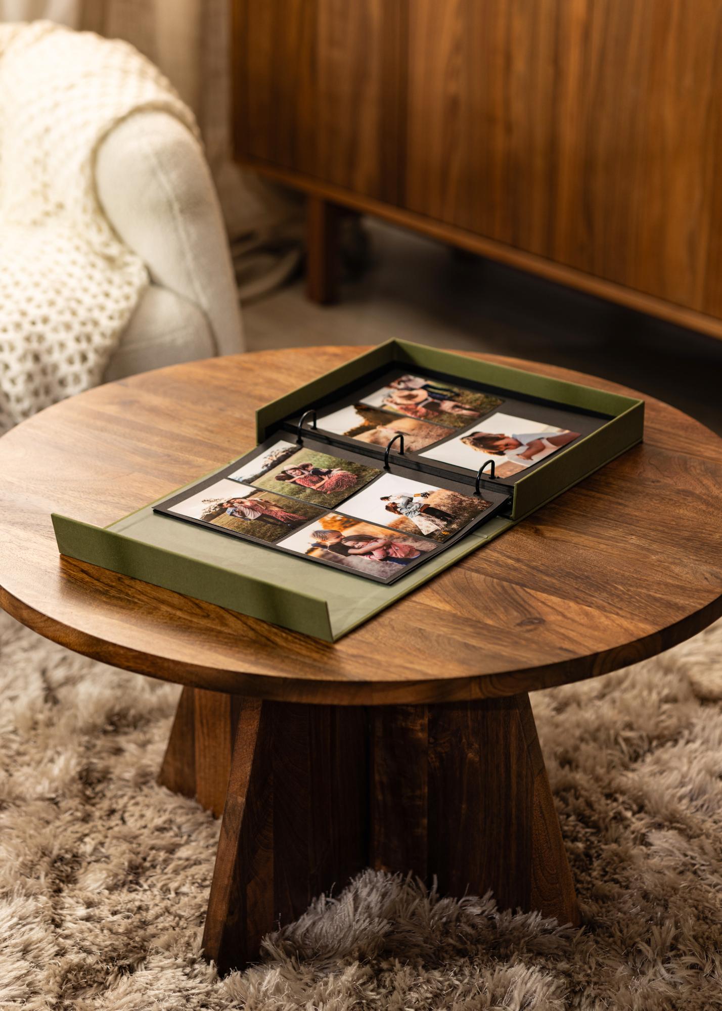 Fotoalbumet är utformat som en lyxig ask du öppnar upp för att komma åt innehållet. När du öppnat albumet möts du av en ringpärm och 30 svarta blad (60 sidor) att fylla med dina meningsfulla minnen. Du klistrar själv in dina bilder vilket ger dig både flexibilitet och utrymme för att locka fram din kreativa sida.