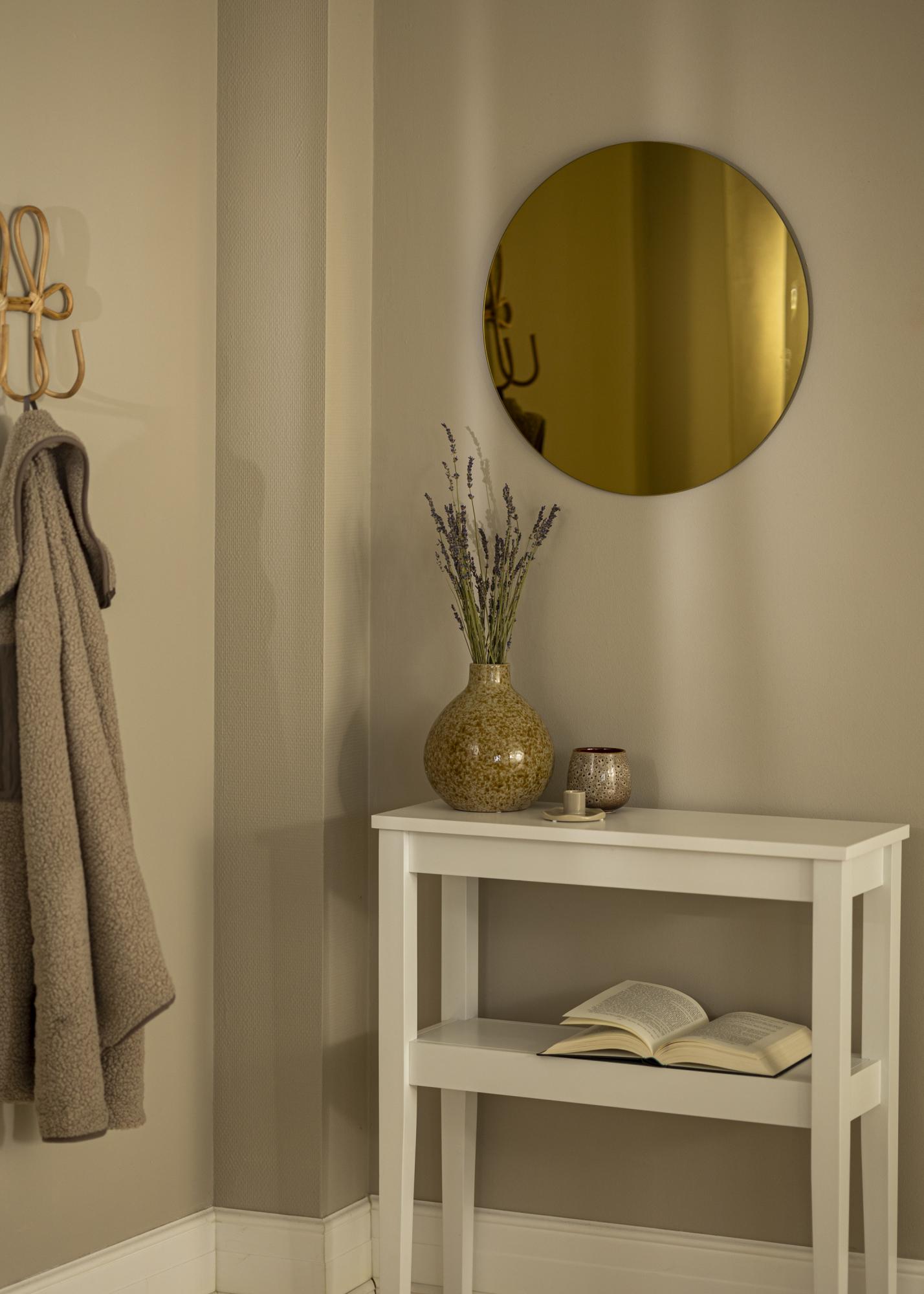 KAILA Rund Spegel Gold är ett perfekt exempel på hur bra det kan bli när stilren form möter effektfulla detaljer. Denna runda spegel är tunn och har ingen ram, vilket ger den en modern och avskalad framtoning. Detta kombineras med ett vackert guldtonat spegelglas som lyfter helheten och gör spegeln smakfullt iögonfallande.