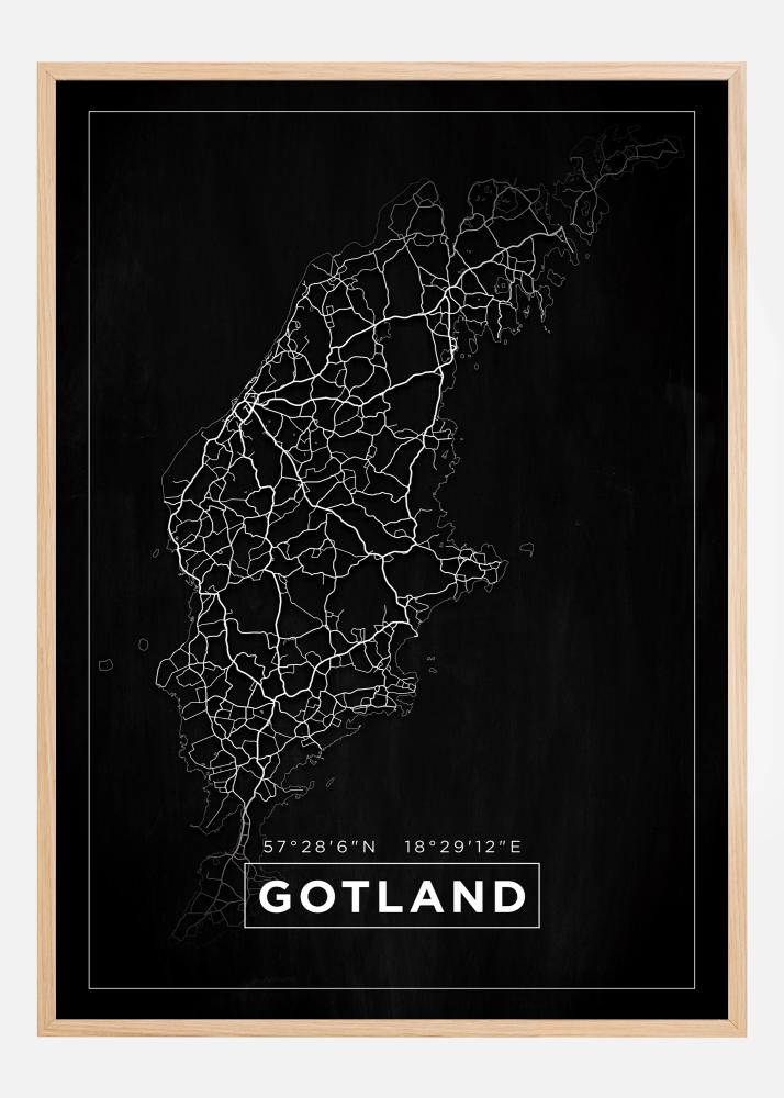 I den här kartan över Gotland ser vi öns konturer och gator i tunnare och lite bredare linjer i vitt. Bakgrunden är svart vilket ger en häftig kontrast och effekt i sin helhet. Upptill och nertill tonar linjerna ut för att snart begränsas av en tunnare ram i vitt. I nedre delen av kartbilden står Golands koordinater angivna och därunder namnet tryckt i vita versaler. Även namnet är inramat i samma snitt som kartan i sig. I posterns ytterkant finns en bredare marginal i svart. Det här är en riktigt snygg kartposter med härliga effekter. Köp till en ram och du har den perfekta presenten till dig själv eller någon annan du vet älskar Gotland!