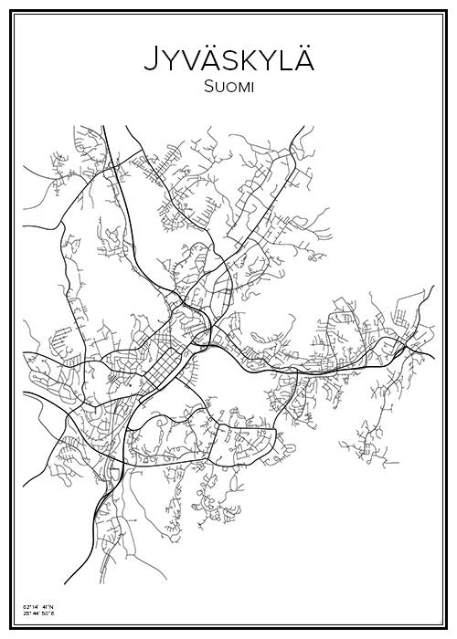 Affisch med en stiliserad karta över vägnätet i finländska staden Jyväskylä, en viktigt trafikknutpunkt. Stadens centrala delar, som är ovanligt tätbebyggt med finländska mått, har ett prydligt rutnät av vägar. Det grafiska trycket av kartan tillsammans med ortsnamn och kartkoordinater ger en stilren poster som passar in i alla inredningsstilar och kan anpassas till inredningen med hjälp av valet av tavelram att rama in motivet med.