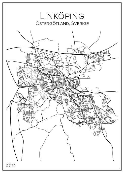 Affisch med karta som visar vägnätet i flygets vagga Linköping. Det grafiska kartmotivet med svart tryck på vit bakgrund gör sig bra i alla hemmets rum och passar bra som present till den som har kopplingar till staden. Rama in postern med en ram som passar till inredningen och häng gärna tillsammans med andra tavlor på ett passande tema.