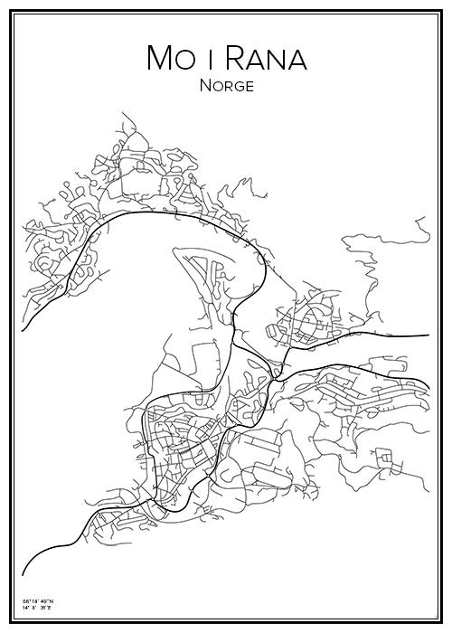 Poster med en stiliserad karta över norska staden Mo i Rana som är hem åt Arctic Circle Raceway, Norges största racerbana. Kartans grafiskt stilrena utformning gör att postern passar in i alla miljöer och är lätt att matcha in med övrig inredning genom att komplettera med tavelram som passar in bland övrigt i rummet. Tavlan är även en fin present att ge till en person som har koppling till staden eller till den som är intresserad av motorsport.
