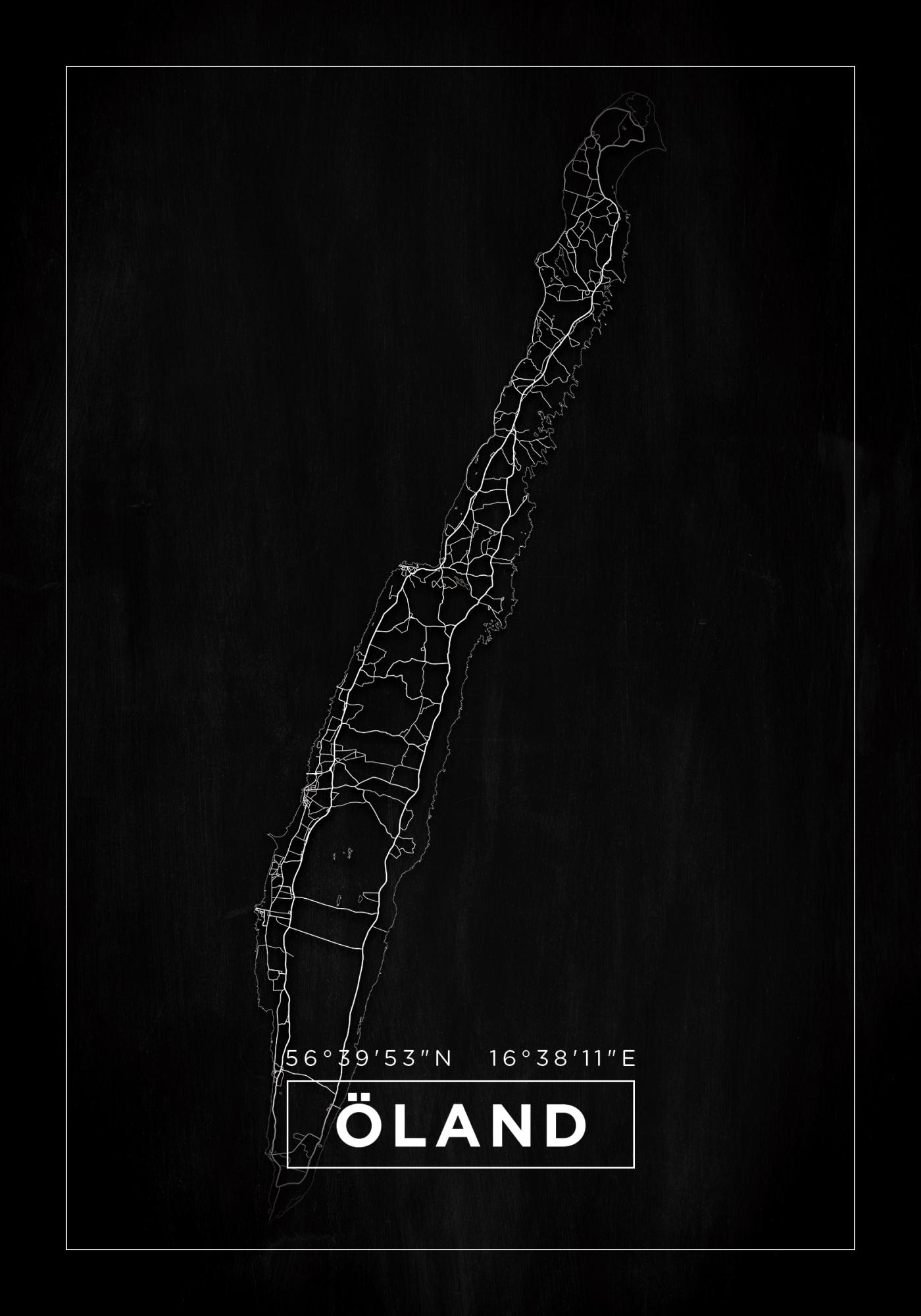 Med den här härliga kartpostern i vitt på svart kan du ge Öland den där extra lilla hyllningen. I sitt stående format målas Öland ut i vitt från norr till söder, med sin norra och sydligaste punkt något uttonad mot den svarta bakgrunden. Nertill i bild står Ölands koordinater angivna och därunder står landskapets namn tryckt i vita versaler. Runt karta och landskapsnamn finns en tunnare linje i vitt och i posterns ytterkant finns en liten bredare marginal i svart. En fantastiskt snygg kartposter som på ett effektivt sätt skapar det där extra lilla blickfånget i ditt hem eller kanske arbetsplats.