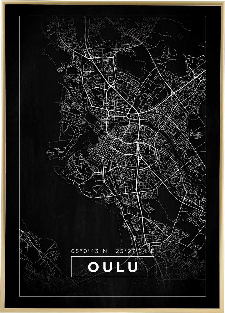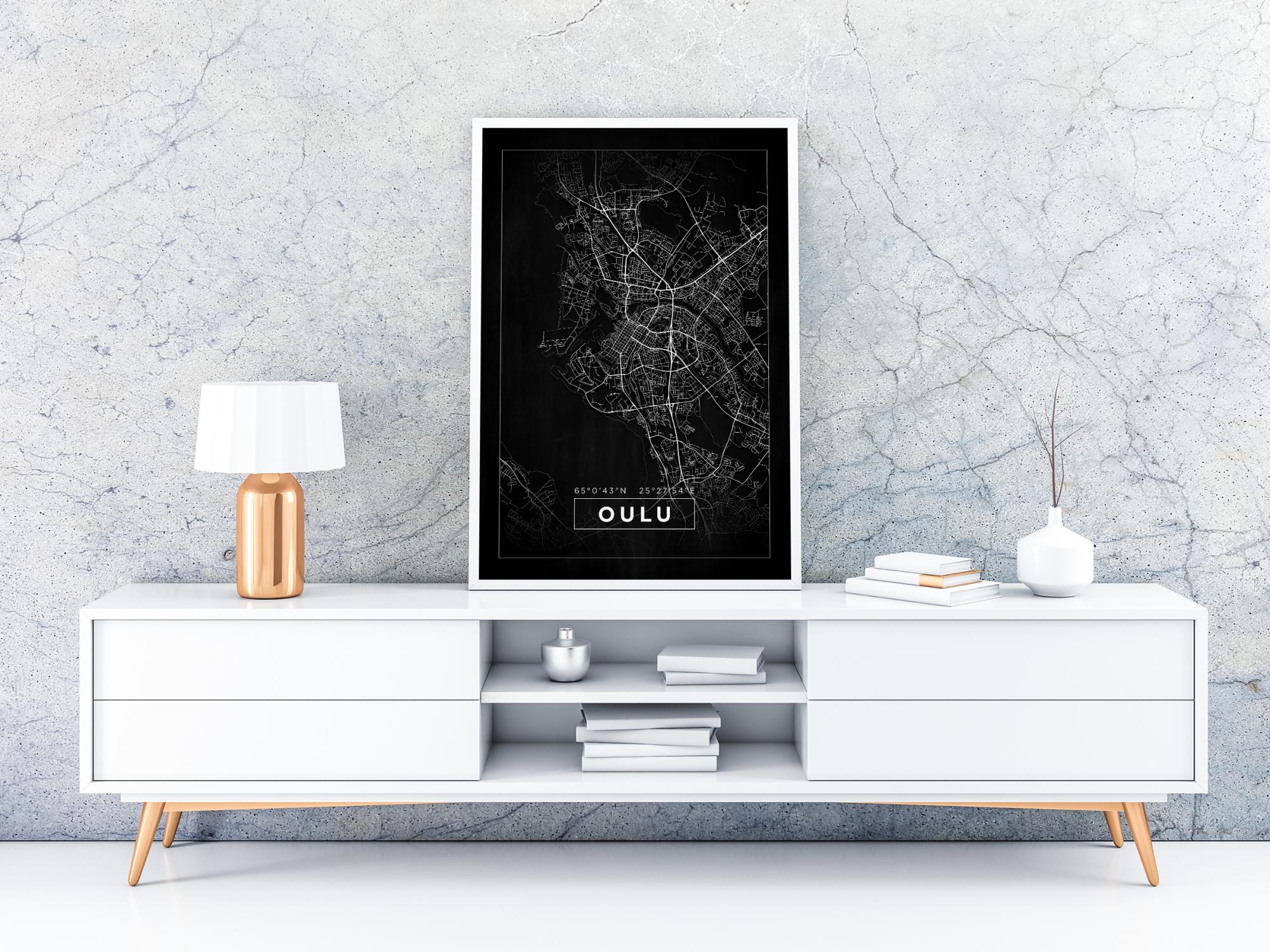 Sätt en personlig touch på hemmet eller arbetsplatsen med kartor över dina favoritstäder! I denna snygga design målas Oulu upp med stilrena linjer i ett modernt utförande. Välj mellan 3 olika färger och hela 8 format!