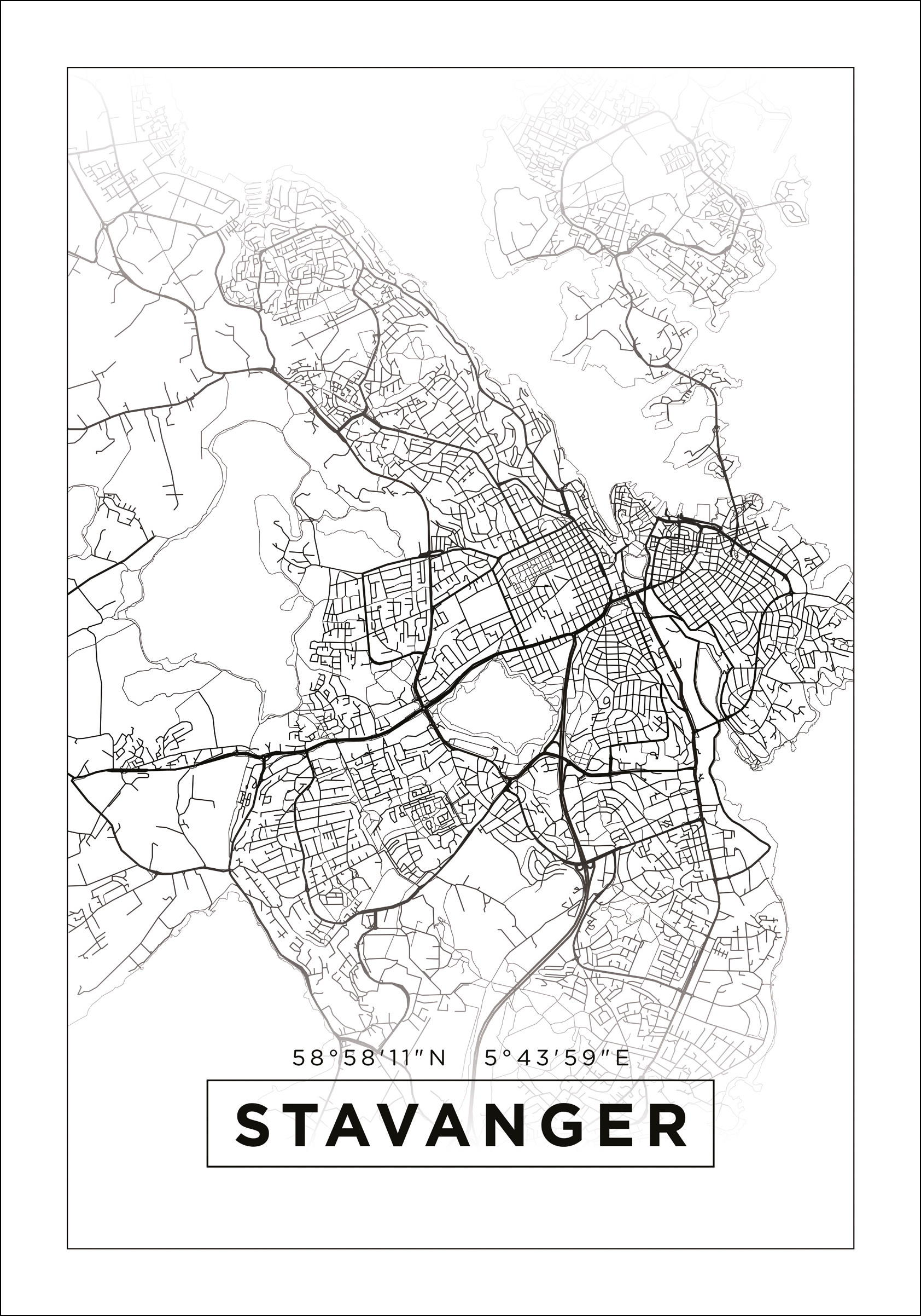 I den här versionen av Stavanger är trycket i svart på en vit bakgrund. Stadskartan tonar diskret ut mot en tunnare svart ram som sedan omgärdas av en bredare vit. Under stadens alla gator finns Stavanger tryckt och inramat. Ovanför namnet står stadens koordinater angivna. En snygg och stilren poster som passar på alla väggar i ditt hem.