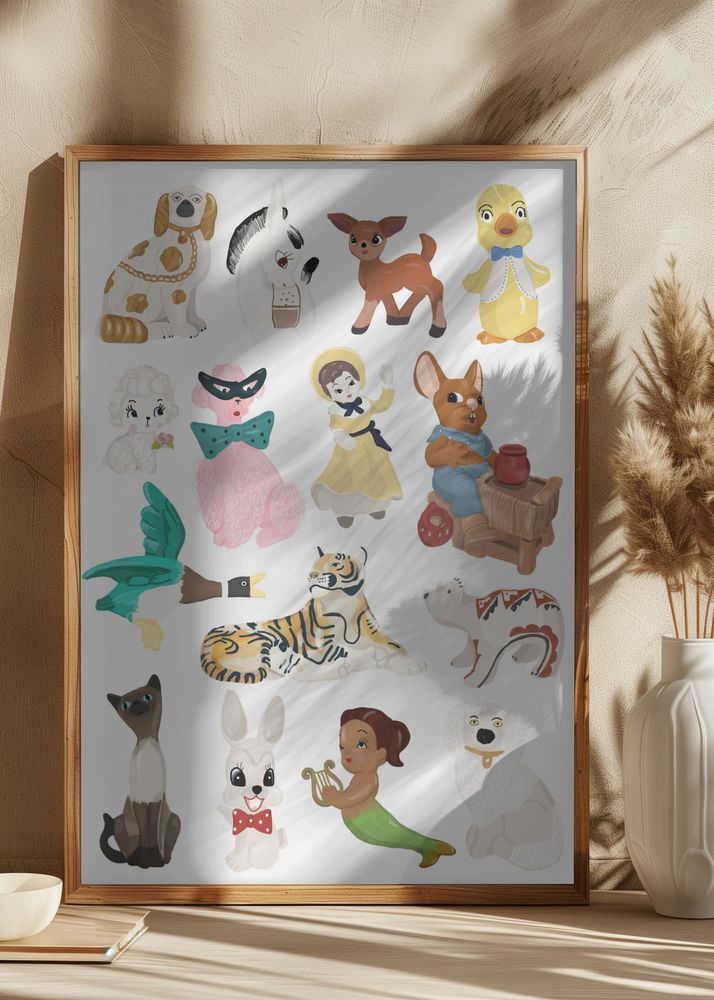 Upptäck en charmig samling av lekfulla djurfigurer som förgyller varje rum med sin livliga närvaro. Denna poster är en härlig samling av illustrerade karaktärer, var och en med sin egen distinkta personlighet och stil. Motivet omfattar en brokig skara av djur, inklusive hundar, en katt, en anka och till och med en sittande björn, vilket gör den till en perfekt affisch för barnrummet eller som en gullig detalj i ett lekrum.