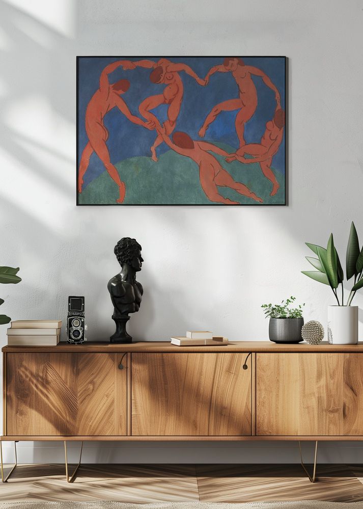 Denna konstnärliga affisch fångar essensen av rörelse och gemenskap med sina fem dansande figurer i en harmonisk cirkel. Med inspiration från klassisk konst och modernistisk stil, skapar detta motiv en dynamisk atmosfär som kan lyfta vilket rum som helst. Postern är idealisk för den som vill uttrycka passion för både tradition och innovation genom sina väggdekorationer.