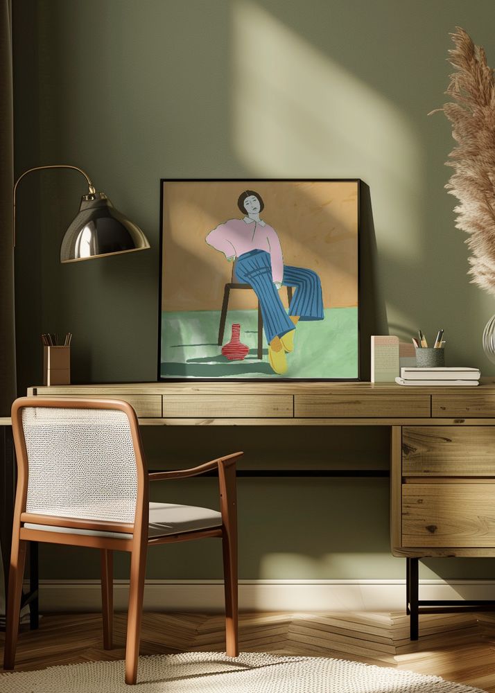 Denna moderna och stilrena affisch framställer en avslappnad kvinnlig figur sittande på en stol, perfekt för den som uppskattar samtida konst och minimalistisk design. Den lugna och tankefulla posen hos figuren ger en känsla av ro och eftertänksamhet som kan hjälpa till att skapa en harmonisk atmosfär i ditt hem eller kontor. Med dess enkla och rena linjer är den här postern ett utmärkt val för den som föredrar diskret, men ändå uttrycksfull väggkonst.