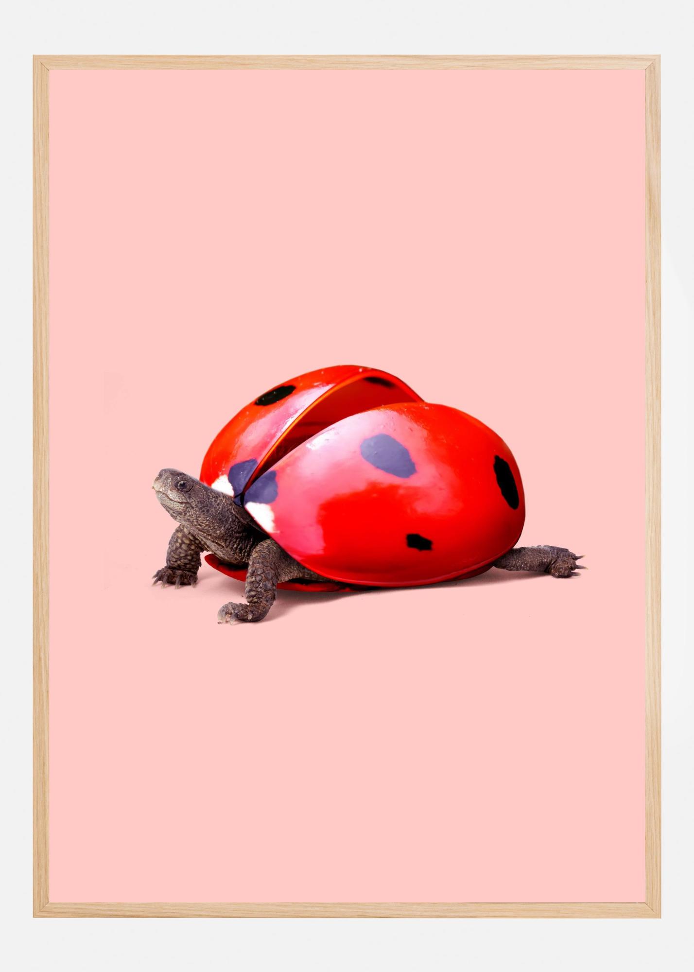 Utforska vår unika poster som skildrar en lekfull kombination av djur- och naturteman. Det här kreativa motivet framställer en sköldpadda vars skal humoristiskt och skickligt är omgestaltet till en ljus och glansig nyckelpiga. Denna fascinerande bild är perfekt för den som uppskattar en twist av natur och fantasi i sin konst, och kommer att sätta en intressant prägel i vilket rum som helst.