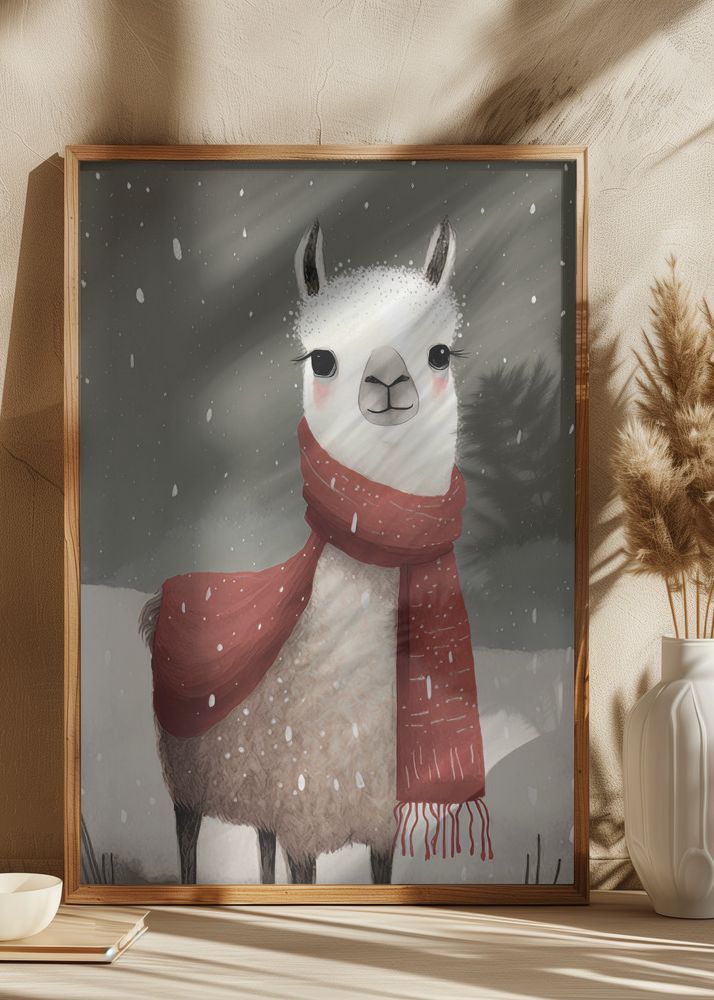 Letar du efter ett charmigt och trendigt tillskott till ditt hem? Vår poster med en bedårande tecknad lama är en absolut favorit. Detta motiv visar en gullig lama med stora, uttrycksfulla ögon och en mjuk päls avbildad i lugna, jordnära toner. Laman är klädd i en livlig röd halsduk som tillför en touch av värme och färg till den annars kyliga och lugna scenen. Denna affisch är perfekt för den som vill lägga till en dos av värme och personlighet i vilket rum som helst.