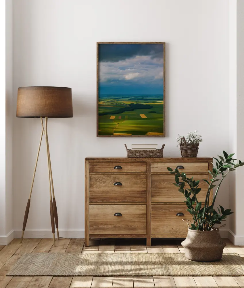 En fantastisk landskapsposter över landsbygden. En rad olika nyanser av grönt och gult skapar en varm och idyllisk scen. Solen strålar ner genom molnen och skapar olika nyanser av ljus på fälten. Känn den friska luften i detta magiska tryck.