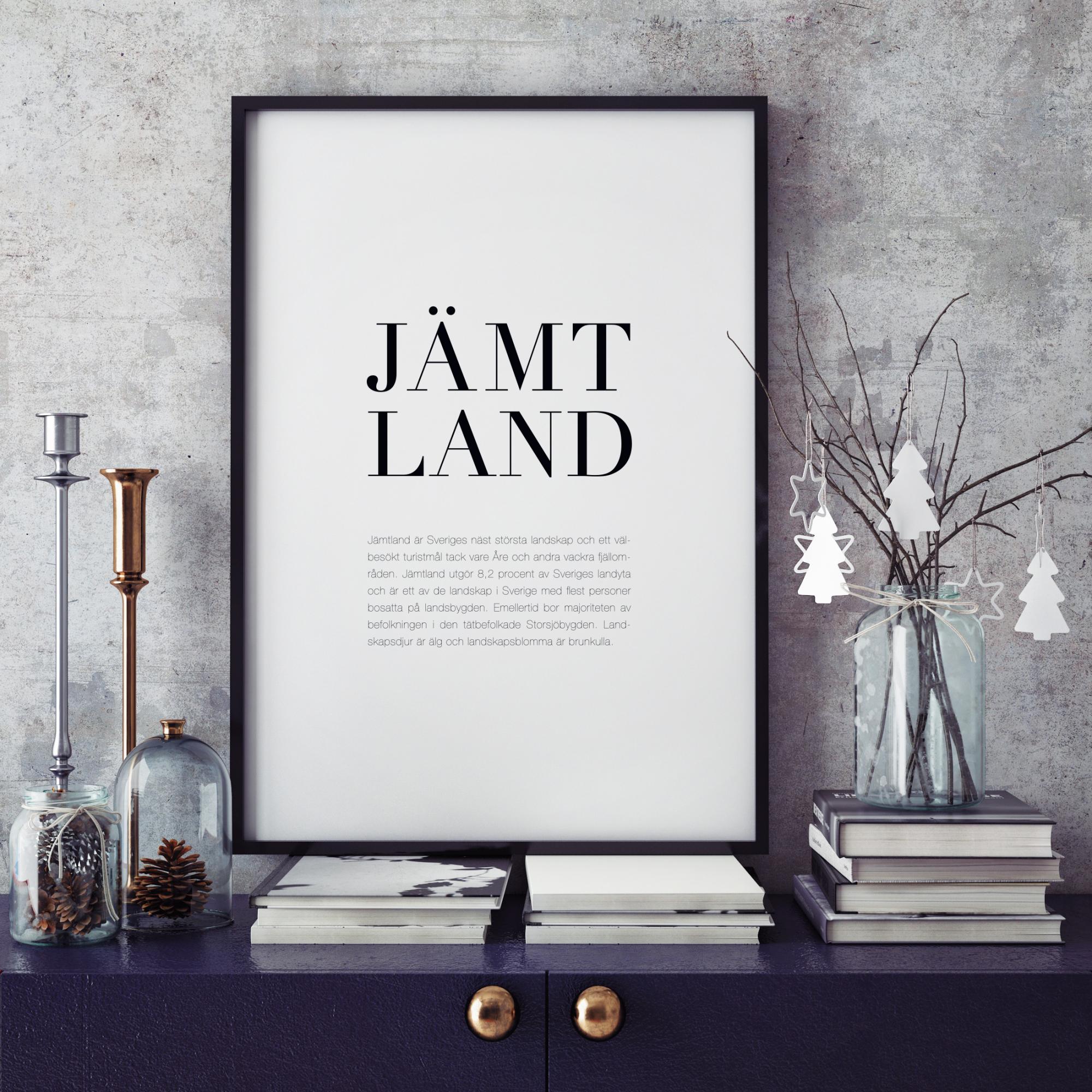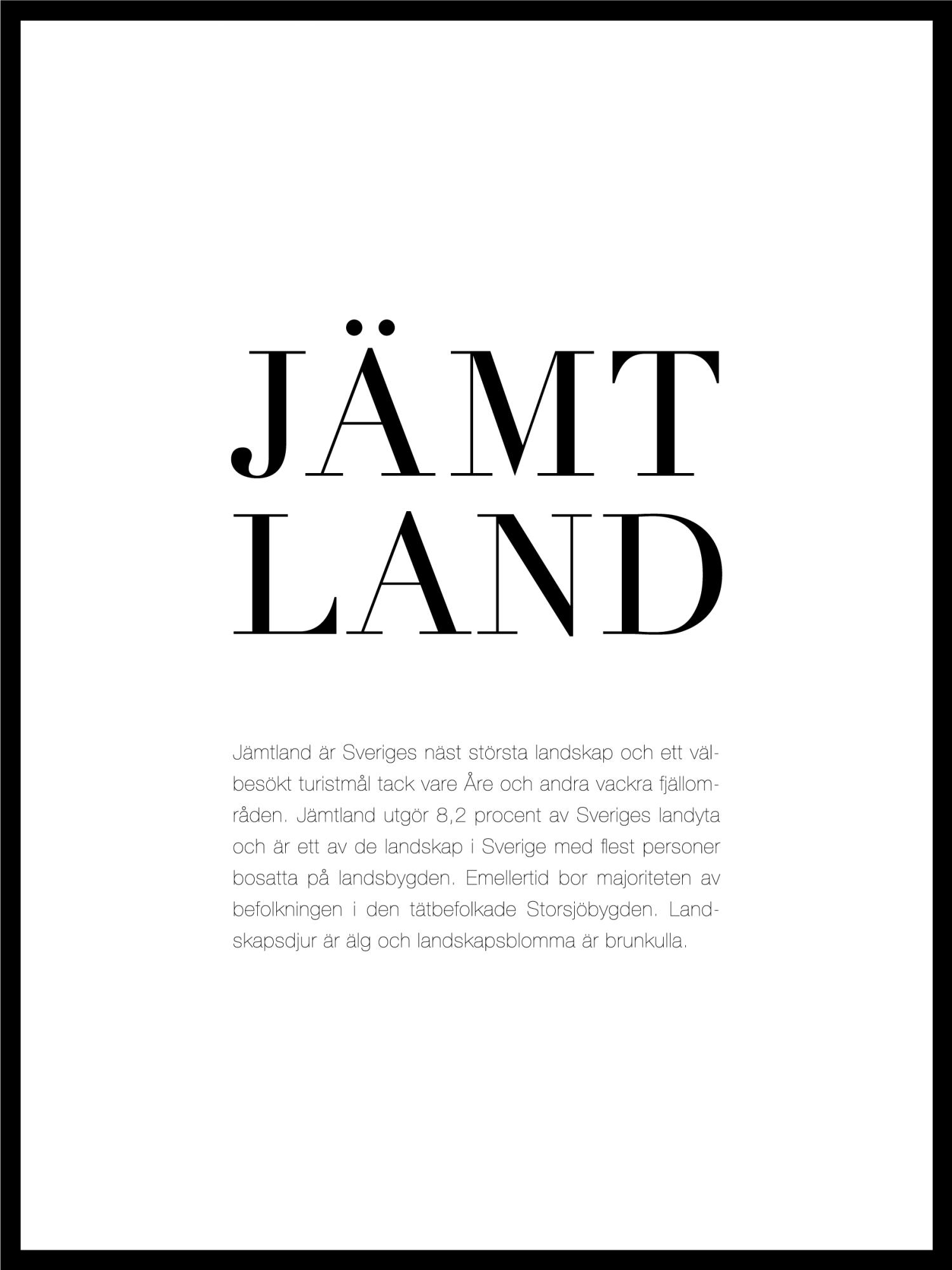 I den här textpostern ligger Jämtland i centrum. Med stora versaler står Jämtland tryckt nästan mitt i bild och en bit under finns en kort beskrivning med roliga fakta om landskapet. Breda marginaler ger ett luftigt och minmimalistiskt intryck. Ett perfekt blickfång då ögonen verkligen dras till dess budskap.