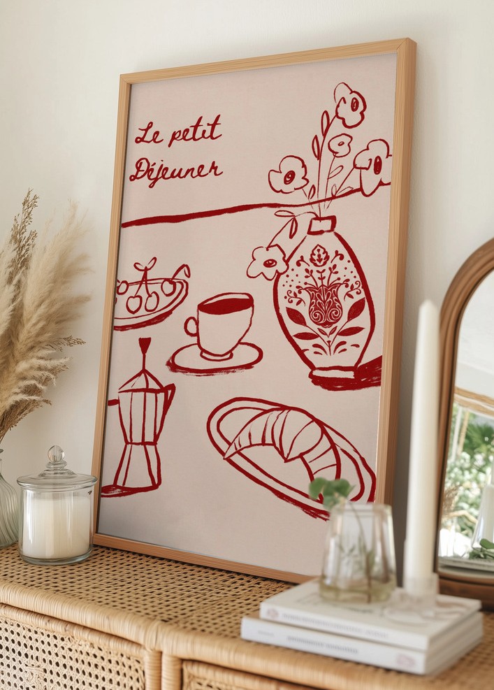 Denna poster fångar essensen av en charmig fransk frukost med dess stilrenaer. Med texten "Le petit déjeuner" i elegant skrivstil påminner affischen om en tidlös morgonstund. Motivet rymmer element såsom en vas med blommor, en kopp kaffe, en croissant och en kaffebryggare, vilket tillsammans skapar en inbjudande och trivsam atmosfär. Denna print passar perfekt i köket eller matsalen för den som vill lägga till en touch av Parisisk elegans.