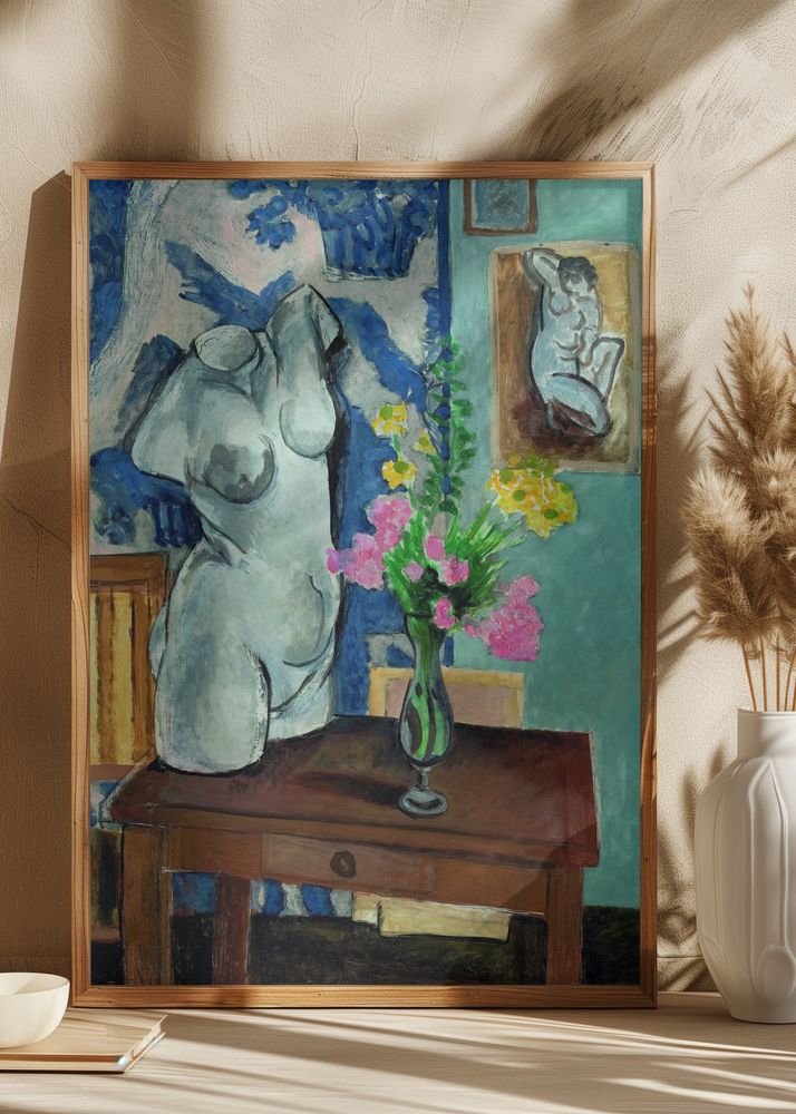Färgpaletten i denna poster är mångsidig med inslag av dämpade jordnära toner som brunt och beige på bordet och skulpturen, i kontrast mot djupa blå nyanser i bakgrunden. Blommorna tillför en levande touch med sina gula och rosa blommor, vilket framhäver och lyfter det konstnärliga uttrycket. Detta print är perfekt för dig som vill addera en mix av klassiskt och modernt till din inredning.