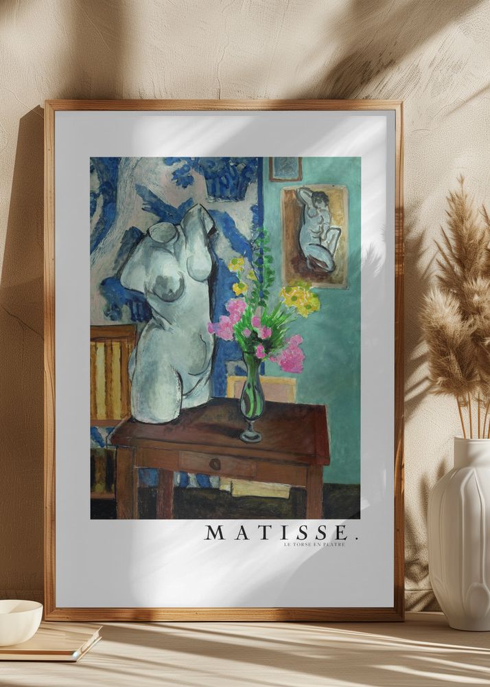 Denna vackra affisch fångar ett elegant stilleben där en skulptur av en torso i gips står i centrum. Bordet som skulpturen vilar på är rikt detaljerat och ger motivet en känsla av tidlöshet. Bakom bordet hänger ytterligare konstverk som förstärker den konstnärliga stämningen i rummet. Färgpaletten i denna poster består av varma toner, inklusive nyanser av blått, grönt och beige, vilket skapar en behaglig atmosfär för betraktaren.