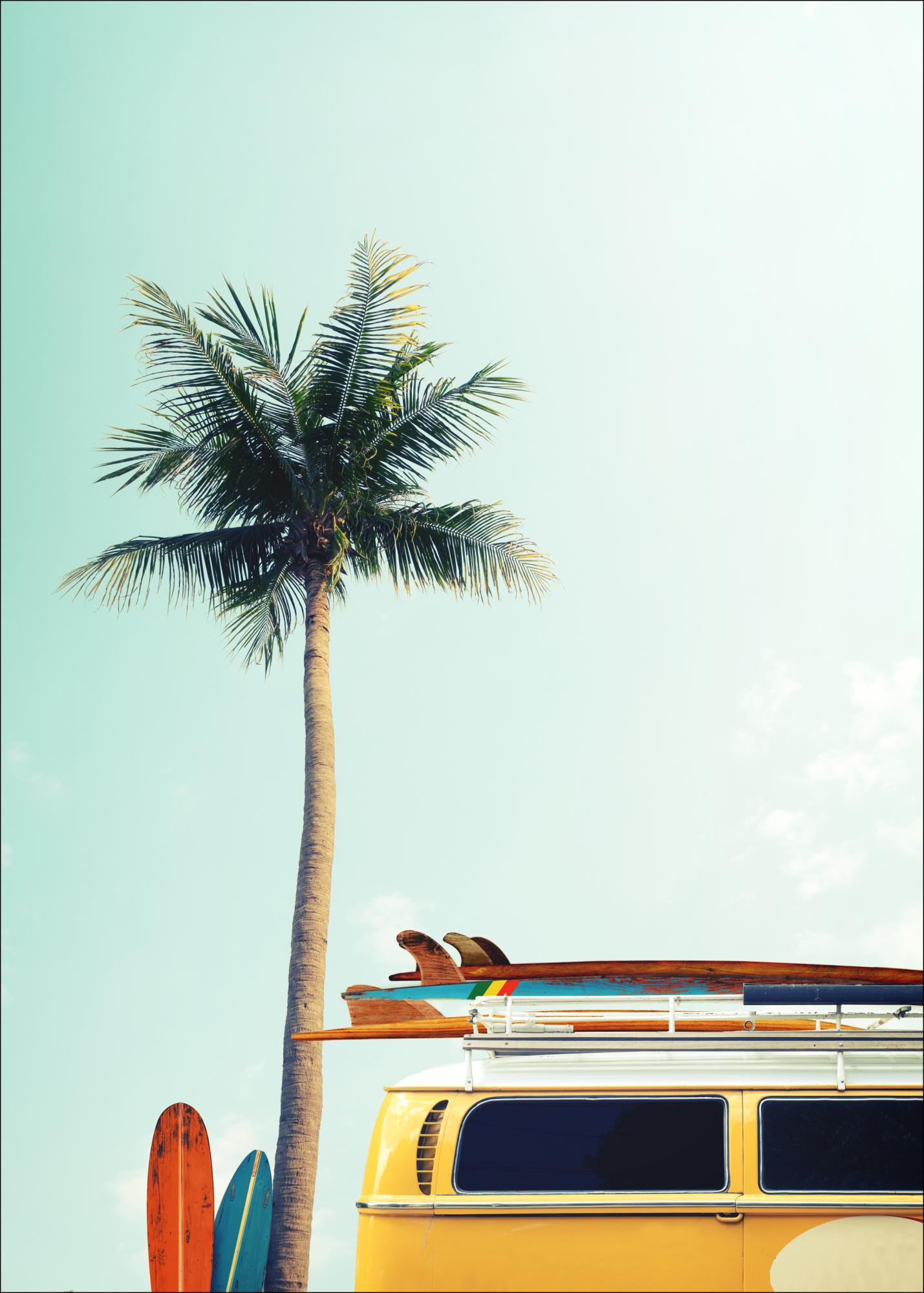 En fotografisk poster med den klassiska folkabussen med sina surfingbrädor, parkerad vid en palm under en molnfri himmel. En färgglad poster som ger en härlig känsla av sommar och frihet. Kombinera gärna med andra favoriter på en större tavelvägg.