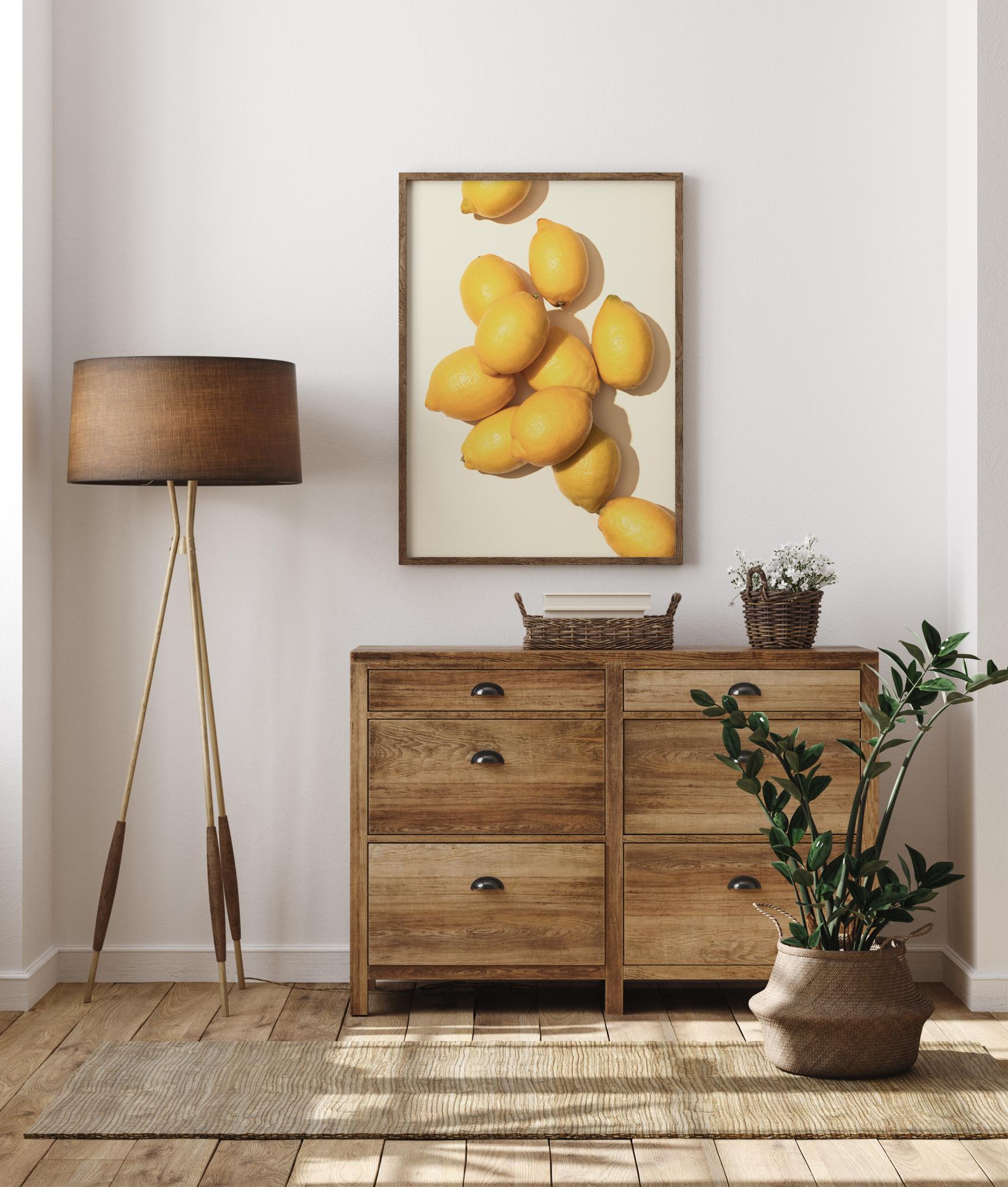 En realistisk poster av citroner. Ljuset ovanifrån projiceras direkt på frukten vilket framhäver skalets grovhet. Ljuset skapar skuggor som sträcker sig över den vita bakgrunden. Känn doften av den här citrusfruktens friskhet när du hänger upp det här trycket i ditt kök.