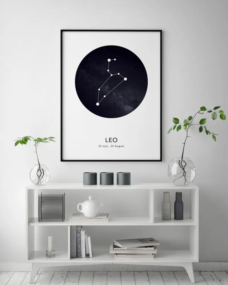 Ge bort en personlig tavla till någon som du tycker om! Den här stilsäkra planschen har motiv av stjärntecknet Lejonet mot en bakgrund i form av en svart och blå stjärnhimmel. Nedanför finns namnet tillsammans med gällande datum på engelska.