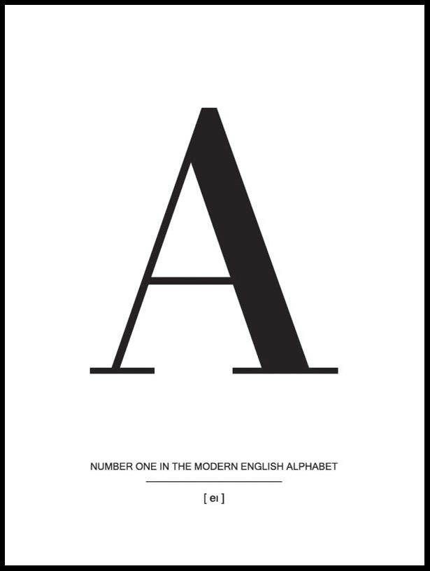 I enkelheten finns det vackra och det bevisar verkligen denna stilrena poster med bokstaven A i svart mot en vit bakgrund. Affischen har en snygg typografi och borde kompletteras med andra bokstavsplanscher från samma serie för att skapa en trendig och vacker tavelvägg. Välj dina favoritposters med bokstäver på och välj bland vårt stora sortiment av kvalitetsramar sen är det bara att låta fantasin flöda hemma på väggarna.