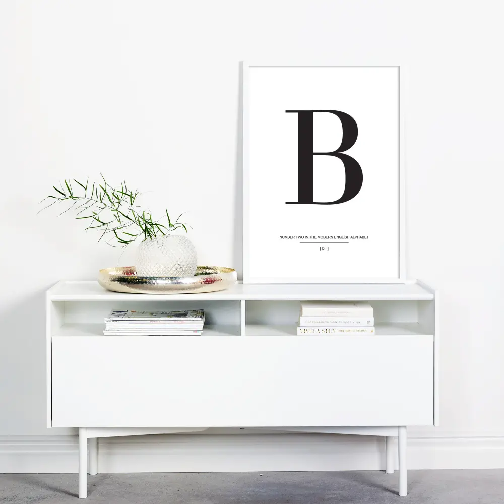 I enkelheten finns det vackra och det bevisar verkligen denna stilrena poster med bokstaven B i svart mot en vit bakgrund. Affischen har en snygg typografi och borde kompletteras med andra bokstavsplanscher från samma serie för att skapa en trendig och vacker tavelvägg. Välj dina favoritposters med bokstäver på och välj bland vårt stora sortiment av kvalitetsramar sen är det bara att låta fantasin flöda hemma på väggarna.