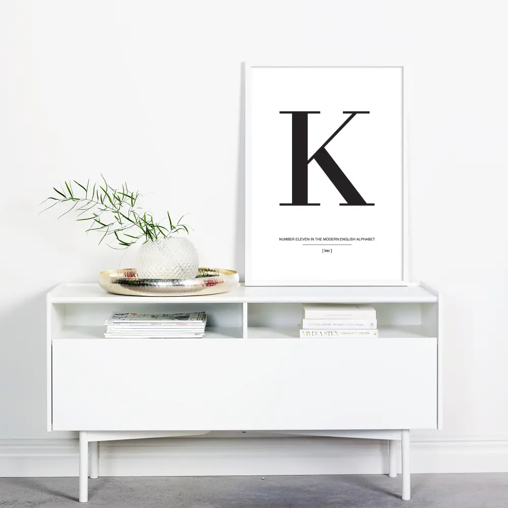 I enkelheten finns det vackra och det bevisar verkligen denna stilrena poster med bokstaven K i svart mot en vit bakgrund. Affischen har en snygg typografi och borde kompletteras med andra bokstavsplanscher från samma serie för att skapa en trendig och vacker tavelvägg. Välj dina favoritposters med bokstäver på och välj bland vårt stora sortiment av kvalitetsramar sen är det bara att låta fantasin flöda hemma på väggarna.