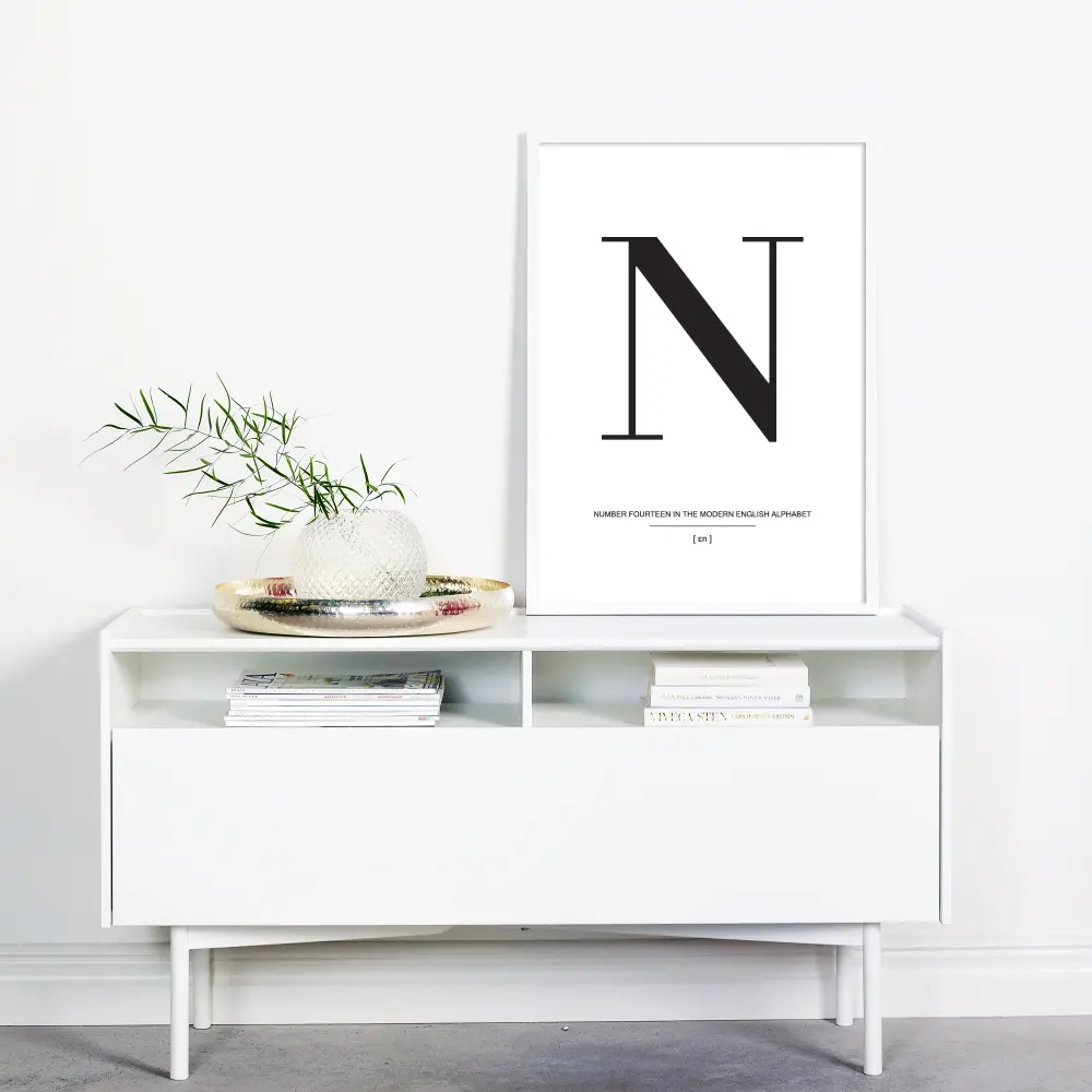I enkelheten finns det vackra och det bevisar verkligen denna stilrena poster med bokstaven N i svart mot en vit bakgrund. Affischen har en snygg typografi och borde kompletteras med andra bokstavsplanscher från samma serie för att skapa en trendig och vacker tavelvägg. Välj dina favoritposters med bokstäver på och välj bland vårt stora sortiment av kvalitetsramar sen är det bara att låta fantasin flöda hemma på väggarna.