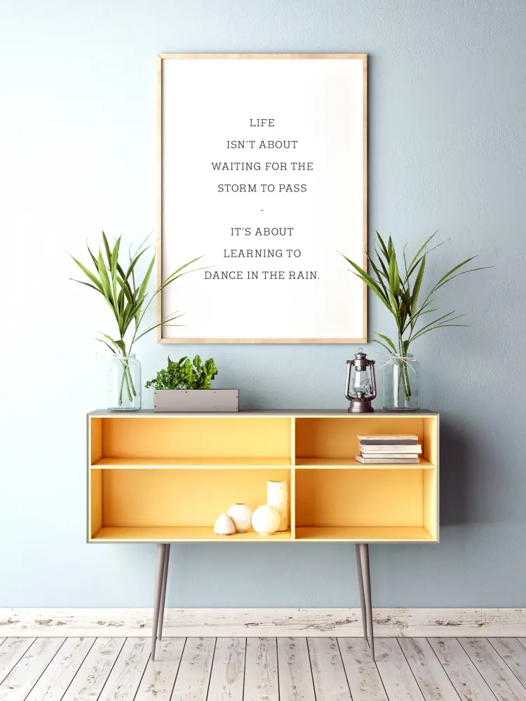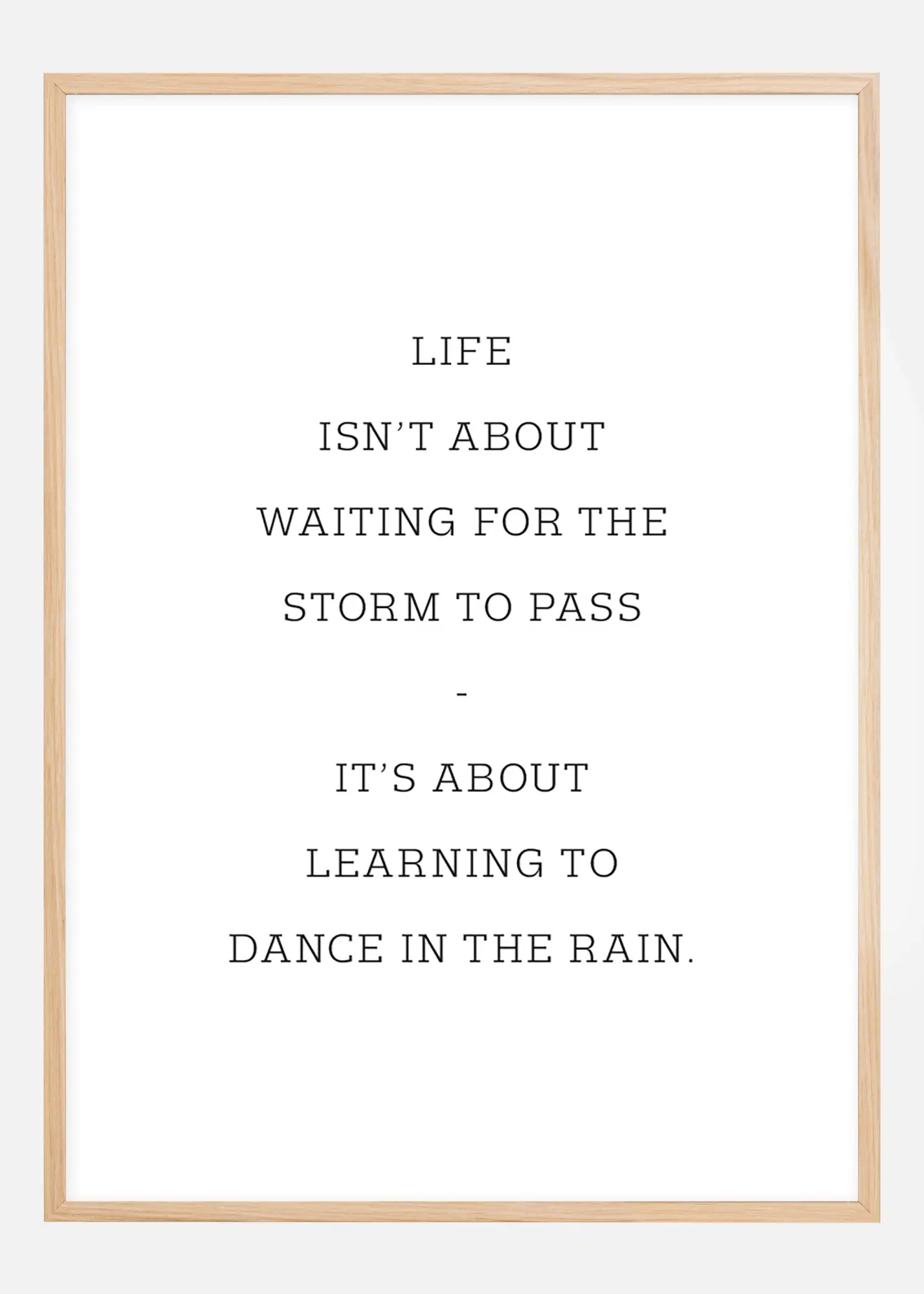 Ett meningsfullt svartvitt motivationstryck som belyser vikten av att ta itu med problem. Skrivet med enkla feta svarta versaler kommer budskapet tydligt fram. Livet handlar inte om att vänta på att stormen ska passera - det handlar om att lära sig att dansa i regnet. En enkel men modern poster att hänga på en vit vägg.