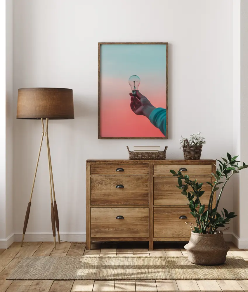 Ett enkelt tryck av en glödlampa som hålls mot himlen. Den vackra ljusblå himlen framhäver den turkosa tröjan på personen som håller glödlampan. Den nedre delen av postern reflekterar en vacker rosa ton som återspeglas i glödlampan. Ett lugnande tryck som skulle se vackert ut mot en pastellfärgad vägg.