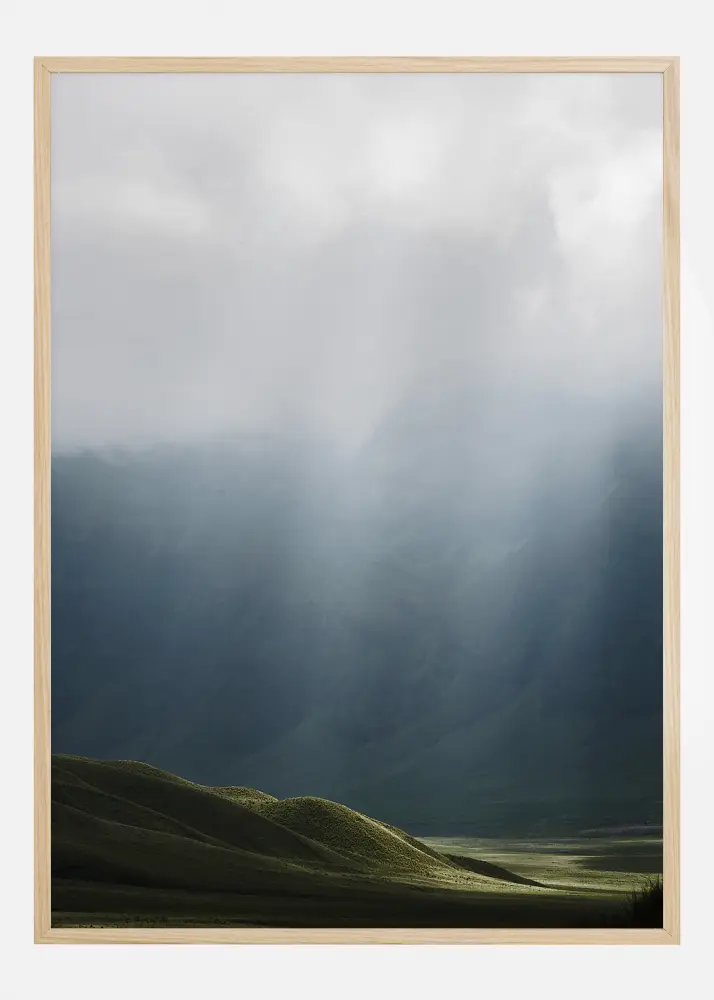 En fantastisk landskapsposter med de mörkgröna kullarna i förgrunden. De högresta kullarna på andra sidan syns knappt på grund av den tidiga morgondimman. De mjuka gröna och gråa färgerna skapar en lugnande och avkopplande känsla. Ett perfekt tryck att hänga i ett vardagsrum.