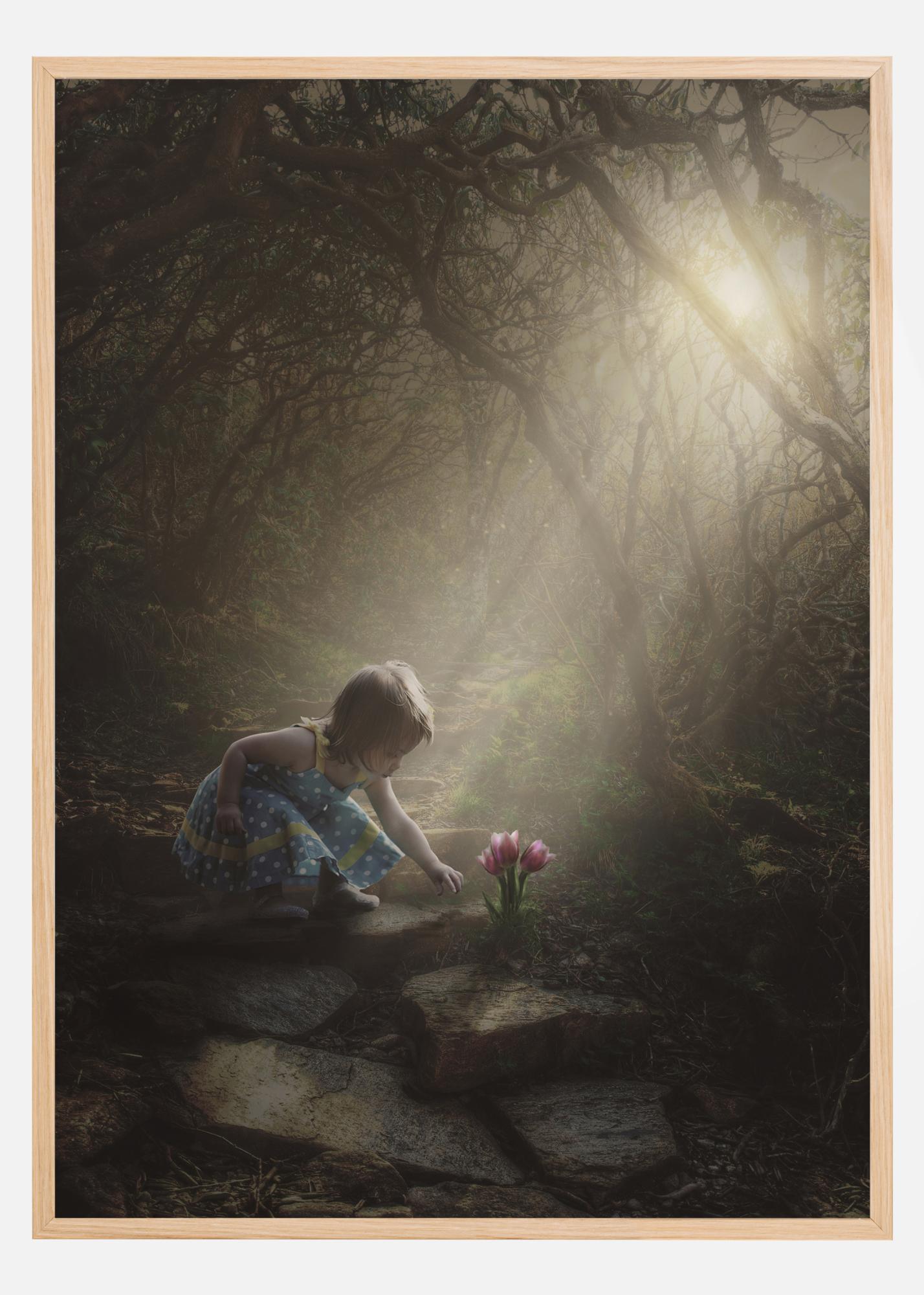 Vacker grafisk konst som tar dig med till en sagolik värld med sitt magiskt ljus, trollska skog och den lilla flickan på utforskande äventyr. En drömlik poster som bara blir bättre och bättre ju större den blir.