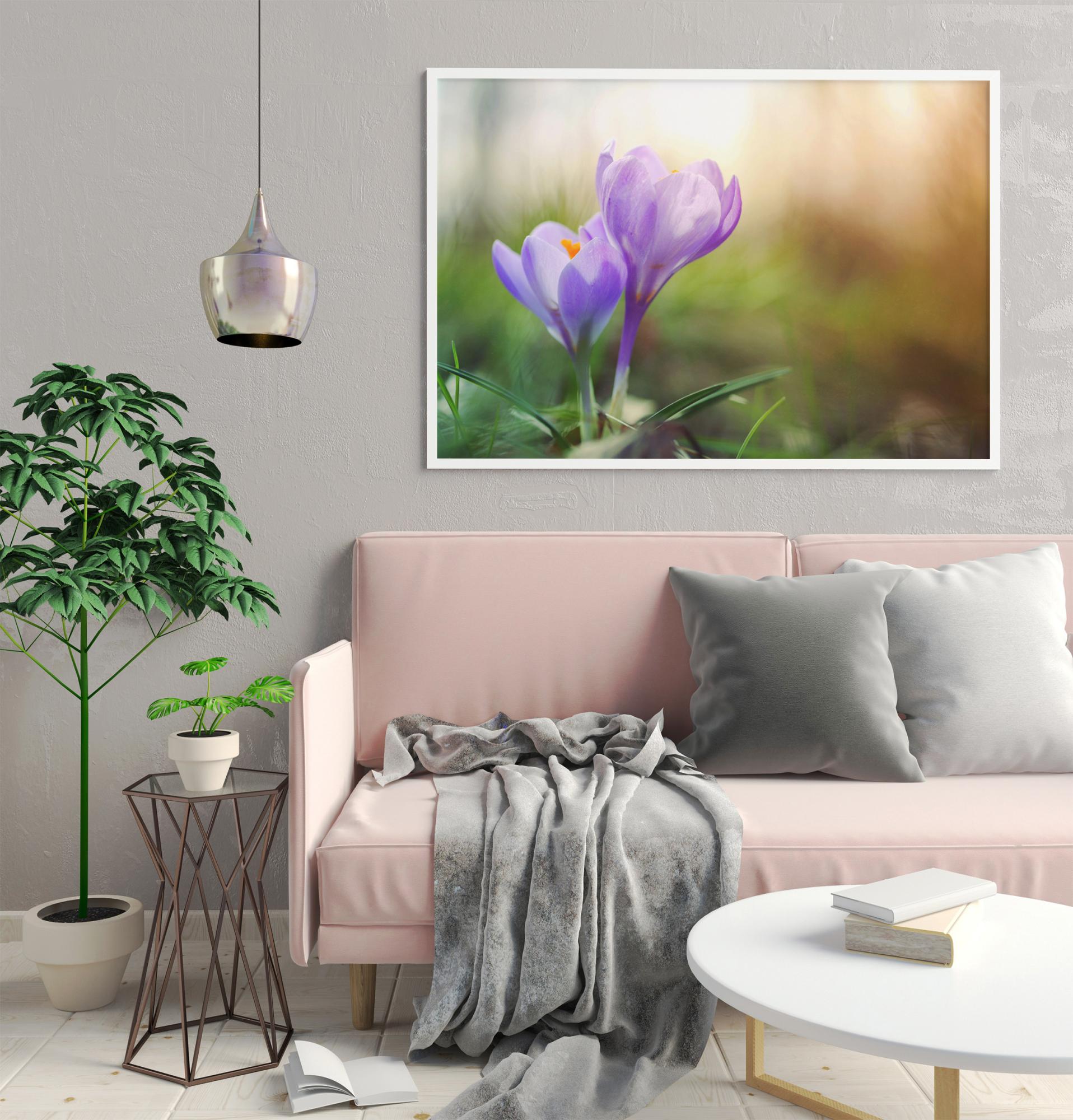 En charmerande bild på vårens kanske färgstarkaste soldyrkare, krokusen. Den utsuddade fonden i komplementfärg ger ett lyft åt blommorna och en harmoni åt fotografiet. Passar den som vill ha färgglädje i hemmet och det är alltid fint att använda en nyans från tavlan som en accentfärg i övriga inredningen. Kombinera gärna med andra växtmotiv för att skapa en helhetskänsla i rummet.