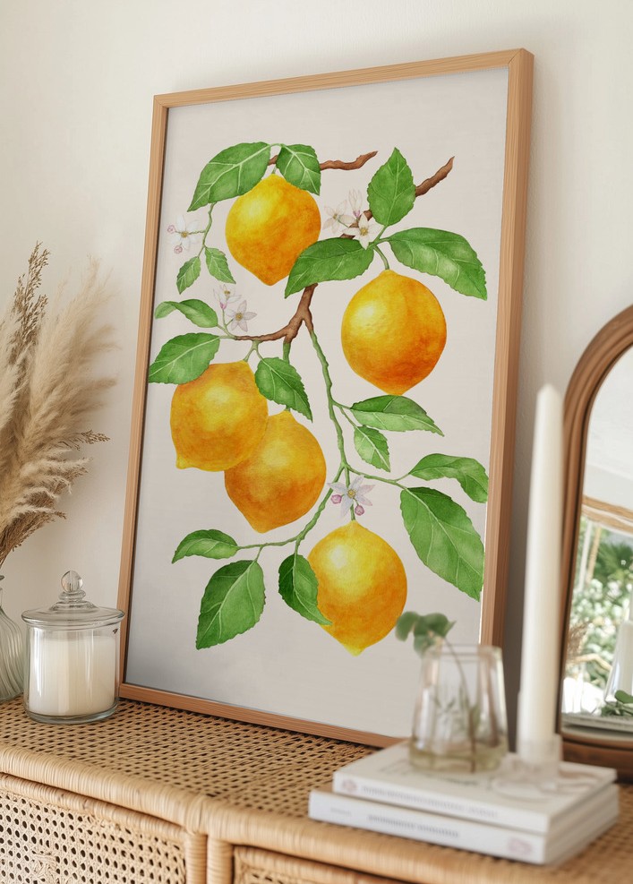 Denna vackra poster framhäver en livfull av ljusgula citroner som hänger frodigt från grenarna. De detaljerade elementen fångar det naturliga och friska i motivet, vilket gör denna print perfekt för att ge en känsla av sommar och friskhet till alla rum. Citronerna är färgstarkt gula och kontrasteras vackert mot de djupt gröna bladen, vilket skapar en iögonfallande affisch att dekorera med.