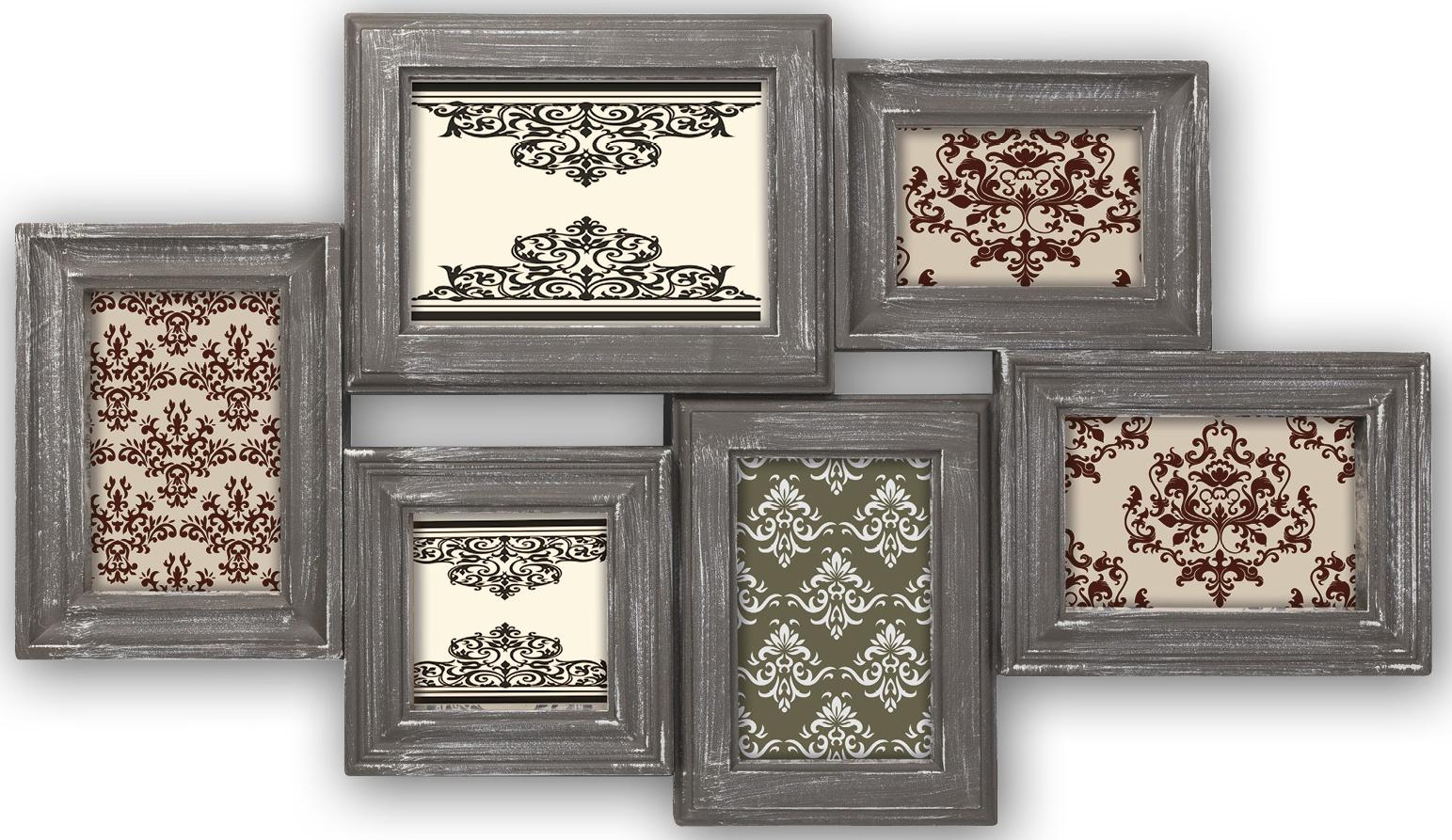Collageram i grått som snyggt ramar in både stående och liggande foton. Den grå ramen är tillverkad i trä och har vitspräckliga inslag som ger den ett rustikt utseende. Denna collageram rymmer 6 bilder i bildstorlek 9x13 cm, 10x10 cm, 10x15 cm och 13x18 cm. Ramens design gör att den snyggt kan matchas på väggen med andra tavlor, eller hängas upp för sig själv och framhäva dina bästa fotominnen. Ramens yttermått mäter 66x38 cm. Väggfäste finns.