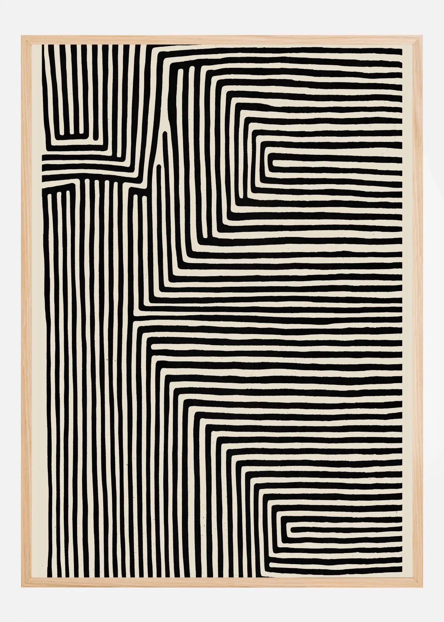 Utforska en värld av minimalistisk konst med vår exklusiva poster som fångar ögat genom ett hypnotiserande mönster av svarta linjer mot en krämig bakgrund. Denna eleganta affisch är perfekt för den som uppskattar modern design och söker ett konstverk som kompletterar en stilren inredning. Kontrasten mellan de djärva, svarta linjerna och den lugna bakgrunden skapar ett intressant visuellt intryck som passar väl in i olika typer av rum och dekorationsscheman.