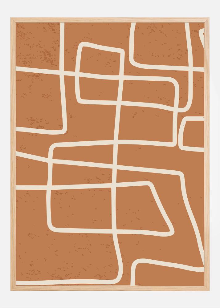 Denna minimalistiska och stilrena affisch presenterar ett nätverk av rena linjer som bildar en slags abstrakt karta eller ett kubistiskt landskap. De beigea linjerna skär genom en varm terrakottafärgad bakgrund och skapar en känsla av ordning och struktur mot en mjukt texturerad canvas. Detta är en print som passar utmärkt för den som uppskattar modern design och de varmare färgspektrat i sitt hem eller kontor.
