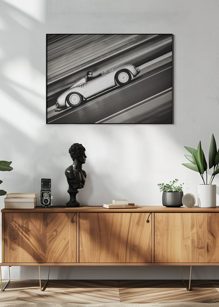 Den här eleganta postern fångar essensen av fart och stil genom sin svartvita framställning av en klassisk sportbil. Med en sofistikerad retrodesign, ger detta print en känsla av tidlöshet och rörelse. Perfekt för den bilintresserade eller som ett stilrent inslag i ett modernt hem, erbjuder denna affisch en blick in i bilhistoriens förtrollande värld.