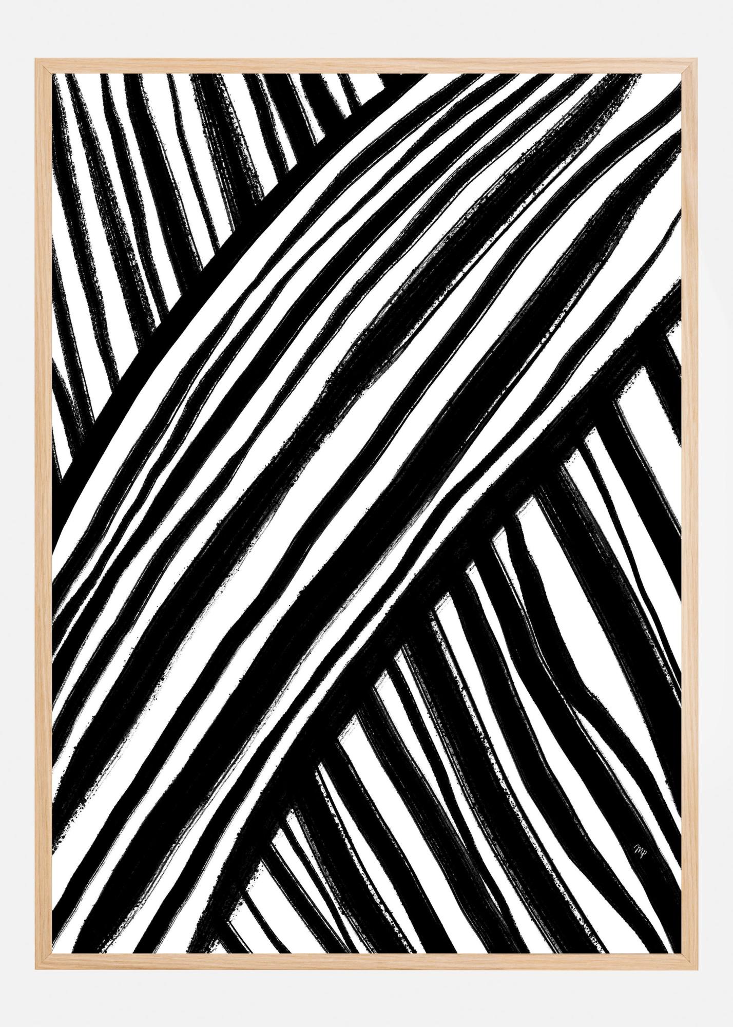 Denna dynamiska och samtida poster kommer att tjäna som ett iögonfallande centrum i vilket modernt hem eller kontorsutrymme som helst. Motivet består av kraftfulla, svepande linjer i svart som bildar en hypnotisk, nästan optisk illusion. De tjocka svarta strecken överlappar och korsar varandra mot en ren vit bakgrund, vilket skapar ett djärvt och grafiskt uttryck som passar perfekt i minimalistiska eller monokroma inredningsstilar.