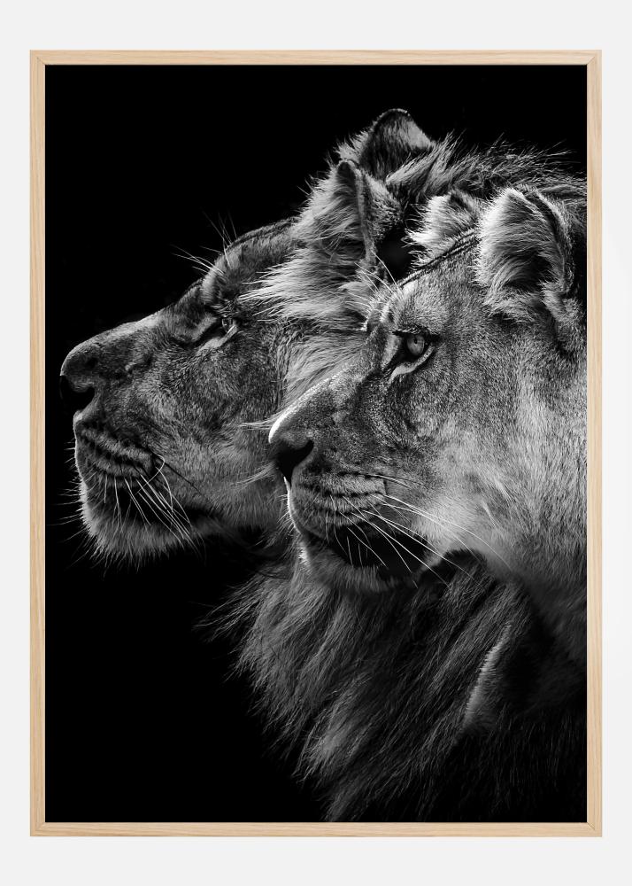 Ett fängslande svartvitt tryck av ett lejon och en lejoninna. Mot den svarta bakgrunden har dessa magnifika varelser ett uttryck av koncentration. Det naturliga ljuset lyser på djurens käklinjer, vilket får dem att verka ännu mer dominerande. En perfekt poster för alla djurälskare.