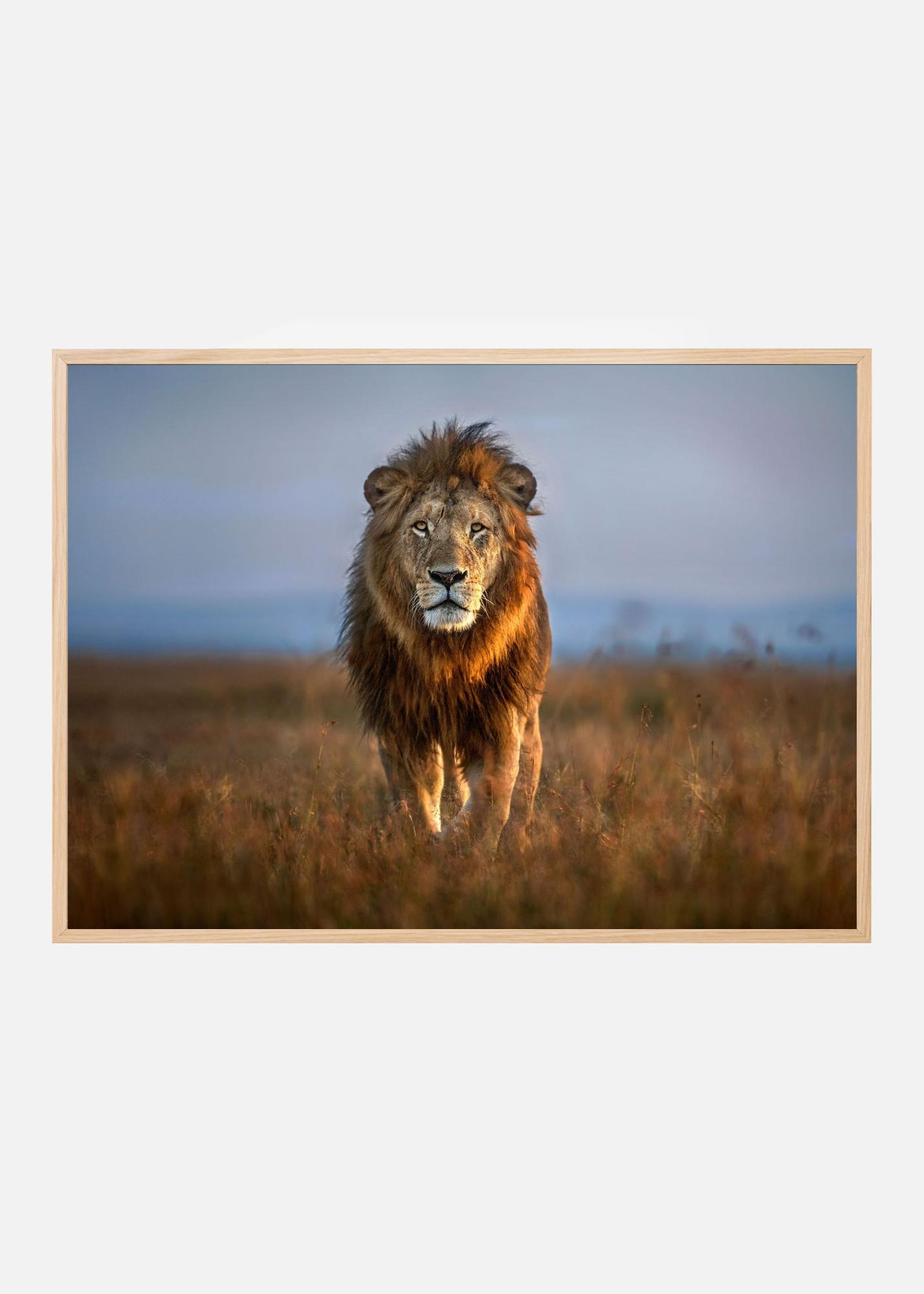 Motivet domineras av jordnära färger med varma toner av brunt från lejonets päls, blandat med de dämpade gröna nyanserna av gräset på savannen. Den ljusblå himlen ger en kontrasterande bakgrund som framhäver lejonet. Dessa färgkombinationer gör denna print både harmonisk och iögonfallande, perfekt för att tillföra en touch av natur till alla inredningar.