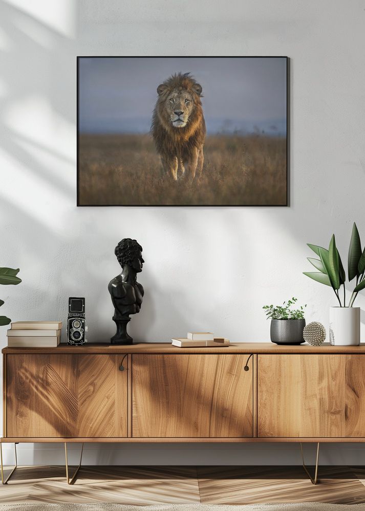 Denna imponerande poster fångar en majestätisk lejonhanne som stolt går över savannen. Den kraftfulla bilden framhäver lejonets styrka och naturliga skönhet, vilket gör den till ett perfekt tillskott för de som vill ha ett kraftfullt djurmotiv hemma. Denna affisch är idealisk för djurälskare och alla som uppskattar vilda djurs elegans och styrka.