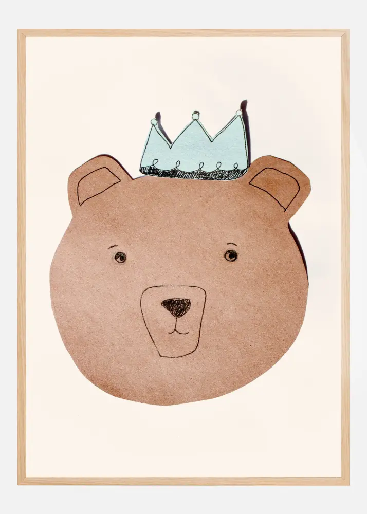 Denna charmiga poster föreställer en lekfull illustration av en björn med en kunglig twist. Motivet utgörs av en söta björnansikte med ögon som utstrålar vänlighet, samt en näsa och mun som tillsammans skapar en varm och inbjudande känsla. Björnens huvud är toppat med en ståtlig krona, som ger en lekfull och fantasifull atmosfär till designen. Illustrationens bruna nyanser blandas harmoniskt med kronans klara blå och gröna toner, samt accenterna av svart på näsan och ögonen. Denna affisch är ett utmärkt val för att frambringa en mysig och sagolik stämning i vilket rum som helst.