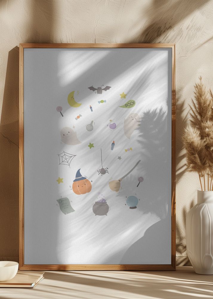 Upptäck vår charmiga poster som är perfekt för att tillföra en lekfull och mystisk atmosfär till ditt rum. Denna mångsidiga print innehåller en samling av ikoniska figurer och symboler associerade med Halloween, såsom söta spöken, en fladdermus, små häxor och magiska tillbehör. Motivets milda och behagliga färgpalett kombinerar pastelltoner med accentfärger som ljusgult, pastellrosa, mild lila, och varma orange nyanser, vilket gör den perfekt för en barnrum eller säsongsdekor.