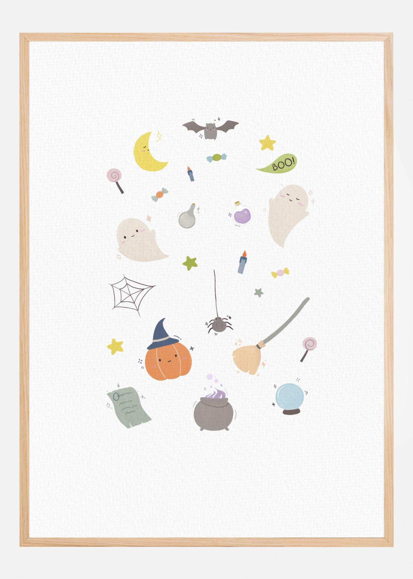 Upptäck vår charmiga poster som är perfekt för att tillföra en lekfull och mystisk atmosfär till ditt rum. Denna mångsidiga print innehåller en samling av ikoniska figurer och symboler associerade med Halloween, såsom söta spöken, en fladdermus, små häxor och magiska tillbehör. Motivets milda och behagliga färgpalett kombinerar pastelltoner med accentfärger som ljusgult, pastellrosa, mild lila, och varma orange nyanser, vilket gör den perfekt för en barnrum eller säsongsdekor.