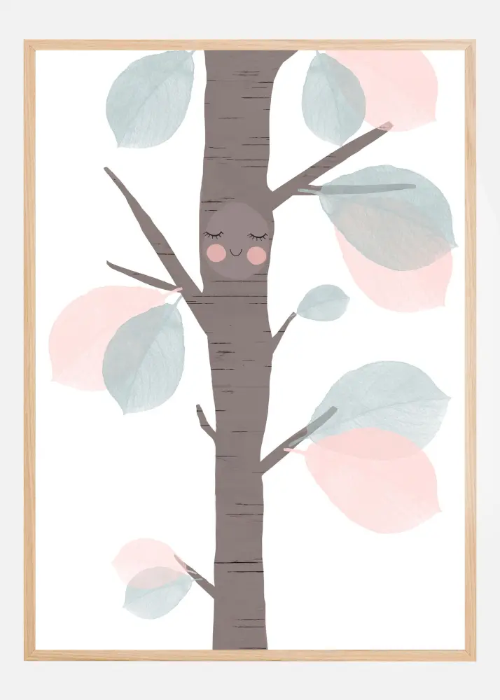 Försköna ditt hem med denna charmiga poster som avbildar en lekfull illustration av ett träd med ett ansikte. Motivet utstrålar lugn och glädje genom det minimalistiska tilltalet och söta uttrycket. Illustrationens mjuka pastellfärger i rosa och grått skapar en behaglig och inbjudande känsla, perfekt för att addera en dos av värme och personlighet till varje rum.