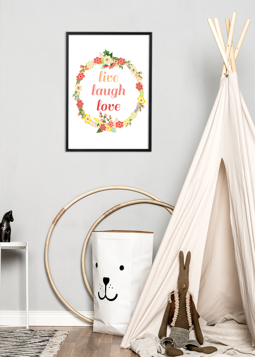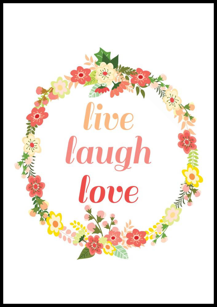 Poster med ett budskap om vad som är det viktiga i livet, att leva, skratta och älska. Texten ramas in av en krans av pastellfärgade blommor som plockar upp färgnyanserna i orden. Häng upp postern någonstans där man ständigt påminns om budskapet eller ge bort den i present till någon som lever efter orden. Köp till en tavelram som framhäver motivet och passar in i inredningen i rummet där affischen ska hängas upp, plocka gärna upp någon utan färgerna i andra inredningsaccessoarer för att skapa en helhetskänsla i miljön.