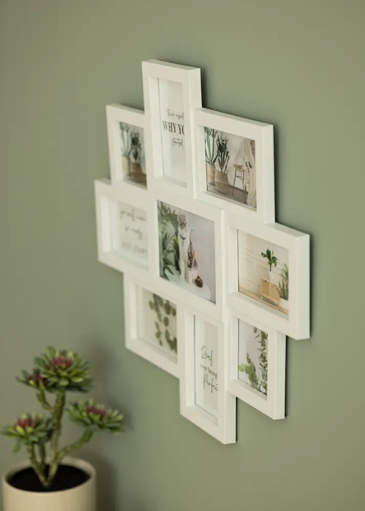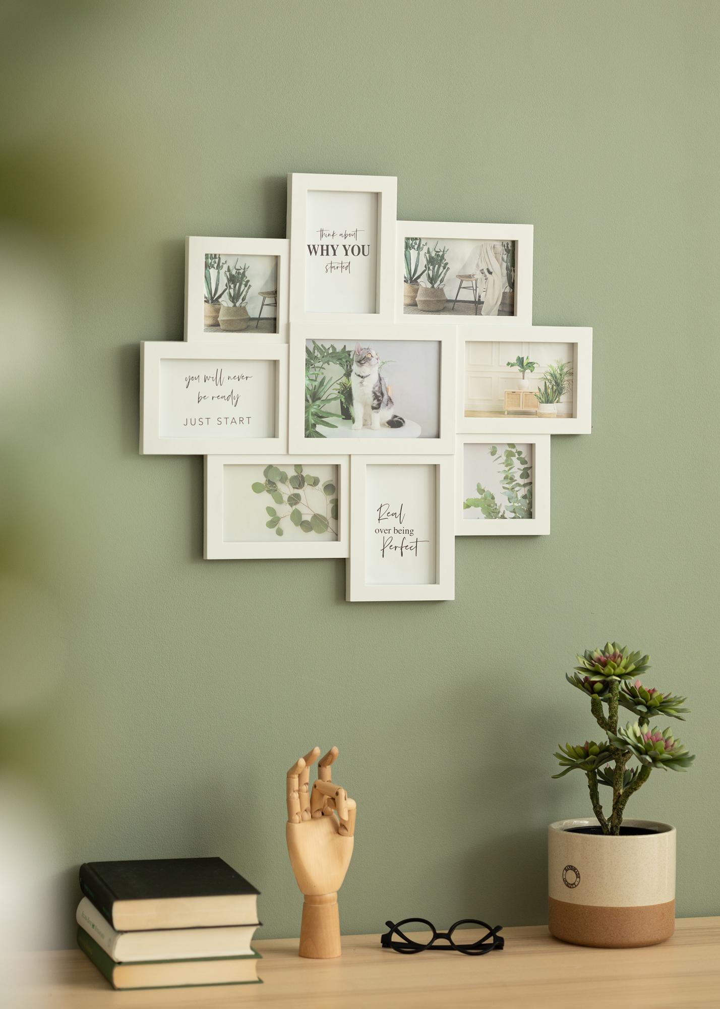 Ramen är tillverkad i komposit och har en sofistikerad vit nyans. Den neutrala färgen gör att ramen blir ett utmärkt komplement till foton i olika färger. Du kan välja om du vill hänga upp din collageram i horisontellt eller vertikalt läge.