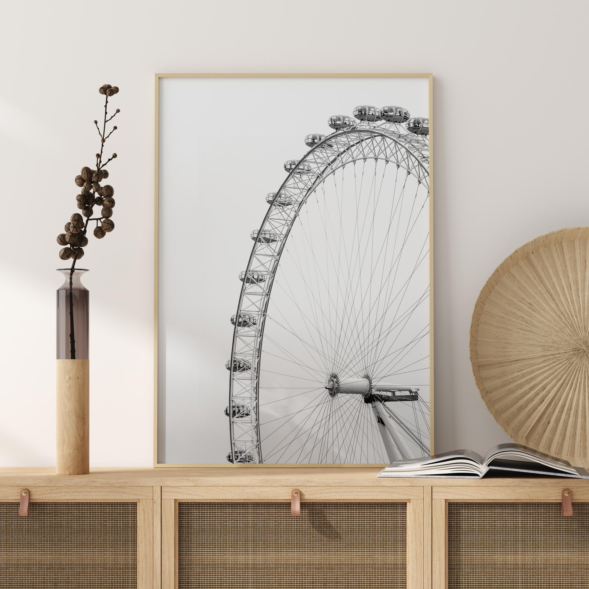 En hisnande poster med London Eye. Med den grå horisonten leder den svarta konturen av London Eye blicken till passagerarkabiner som sitter på hjulet. Ett imponerande tryck som framhäver hjulets storlek. Ett vackert tryck som skapar en känsla av oändlighet.