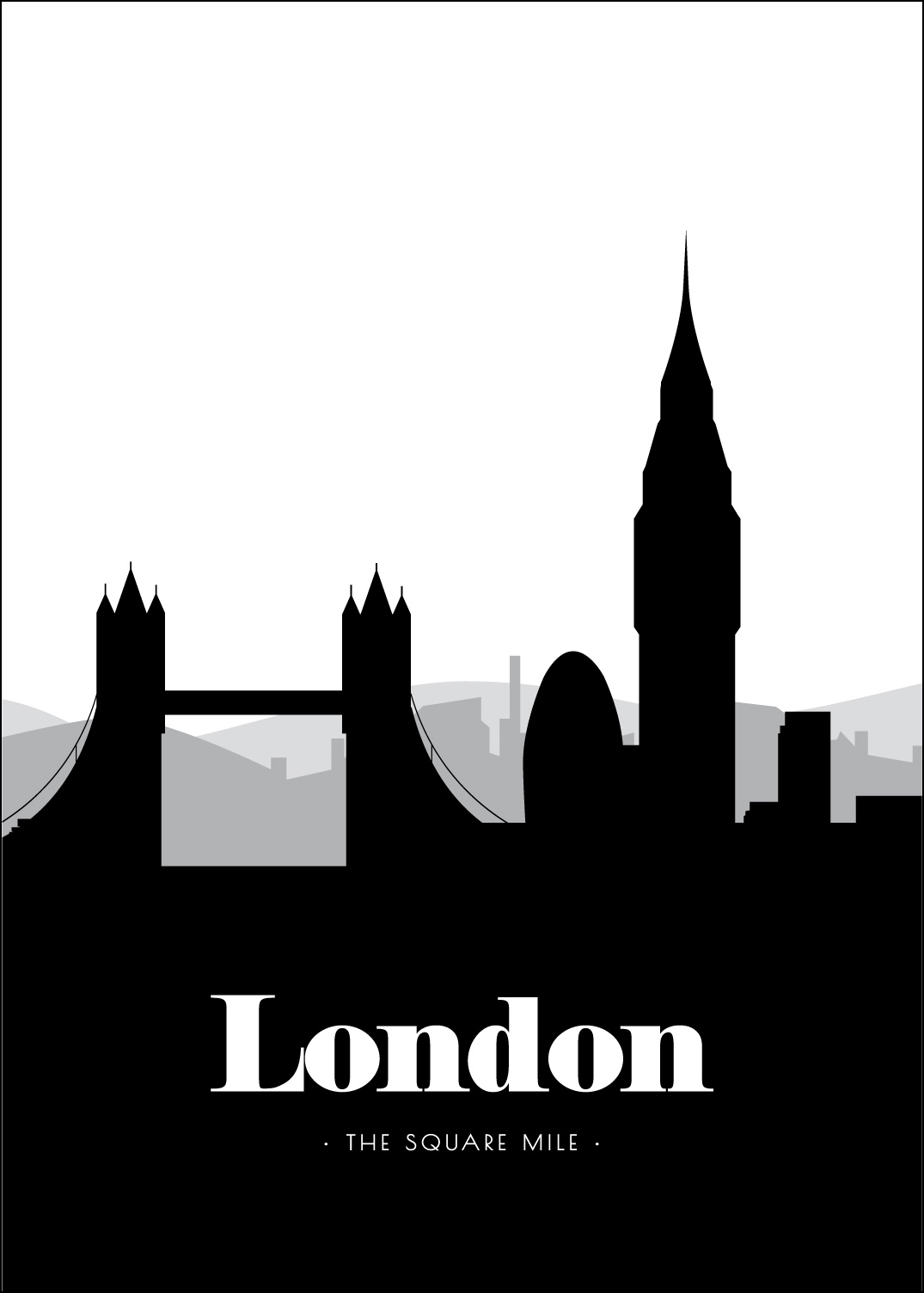 Dröm dig hela vägen till London med denna härliga print på väggen. Motivet föreställer en mysig siluett där du bland annat kan urskilja London Bridge, London Eye och Big Ben. I bakgrunden syns ett böljande bergslandskap och skorstenar i vackra grå toner. Tryckt i vitt finns texten "London" och under den "The Square Mile" som är ett av stadens smeknamn. London Skyline gör sig utmärkt tillsammans med en svart eller vit ram av en något tjockare modell. Välj mellan flera olika storlekar och prisklasser!